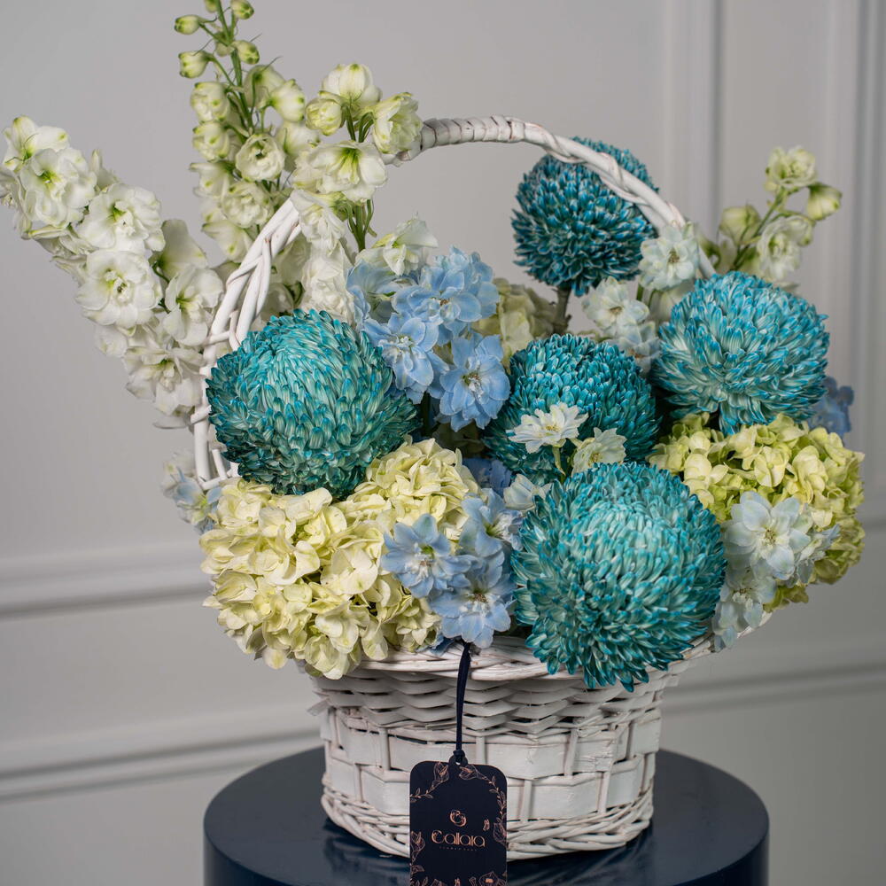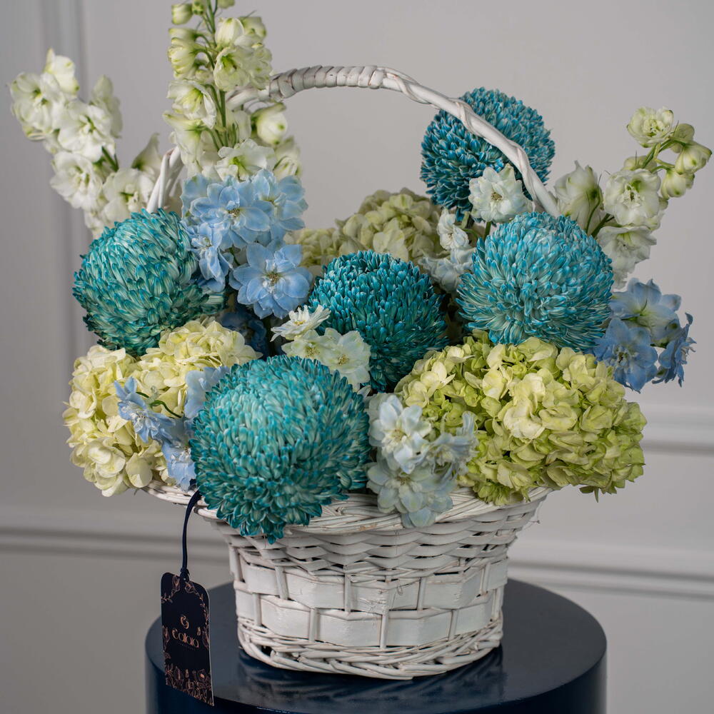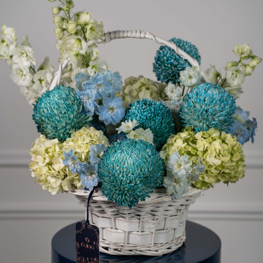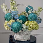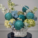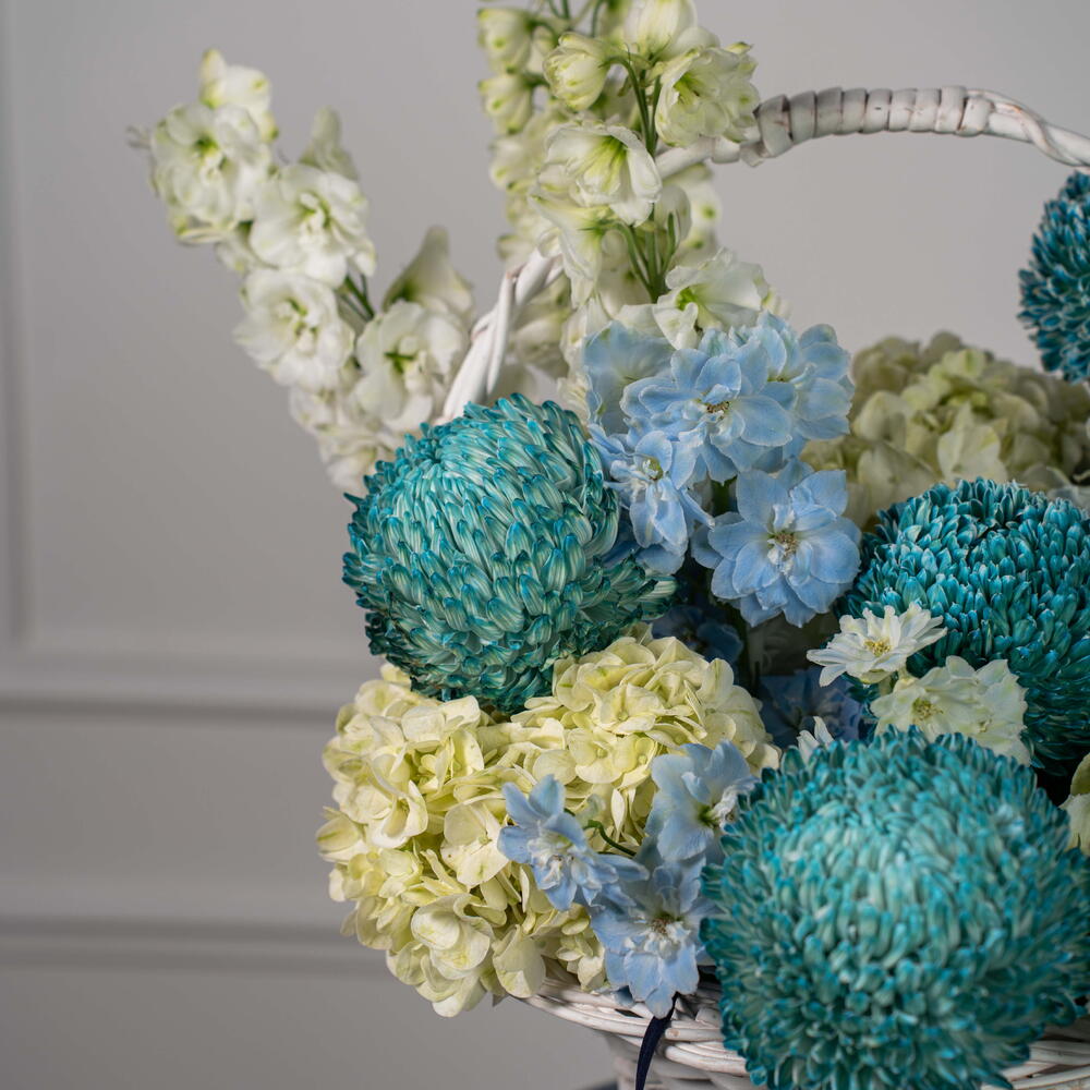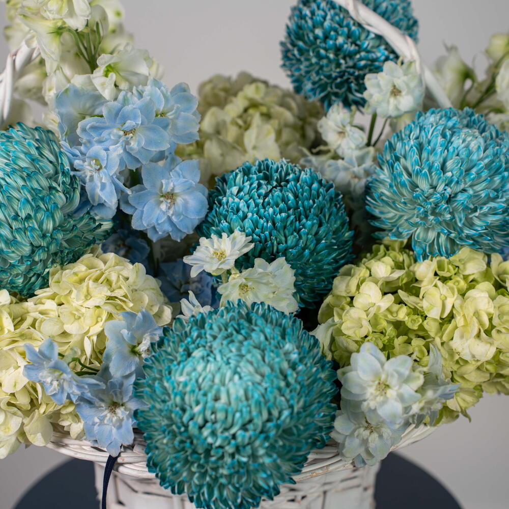 delphinium white - 3 шт. дельфиниум небесно-голубой - 2 шт. гортензия лаймово-зелёная - 3 шт. хризантема пионы светло-голубой - 5 шт.
