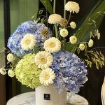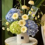 Эта композиция передаёт безмятежную красоту мира грёз. Расписанные вручную керамические вазы с классическими сине-белыми узорами бережно вмещают подборку свежих, нежно-белых цветов и изящных голубых гортензий. Это вневременная композиция, которая привносит в любую комнату нотку спокойной элегантности.