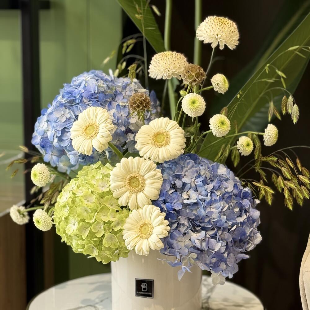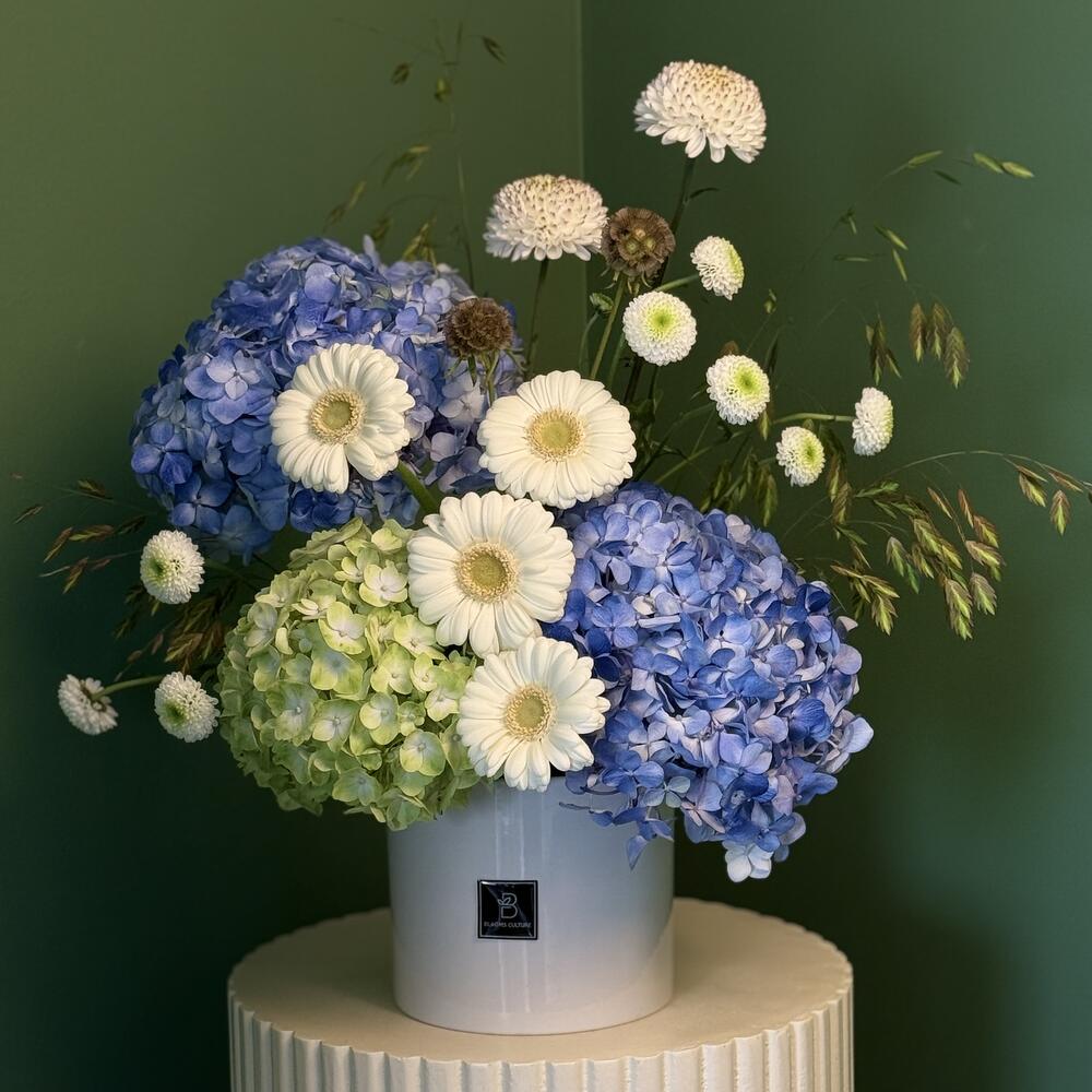 Эта композиция передаёт безмятежную красоту мира грёз. Расписанные вручную керамические вазы с классическими сине-белыми узорами бережно вмещают подборку свежих, нежно-белых цветов и изящных голубых гортензий. Это вневременная композиция, которая привносит в любую комнату нотку спокойной элегантности.