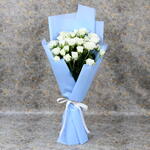 11 белых маленьких роз В красивой упаковке небесно-голубого цвета Перевязаны белой лентой