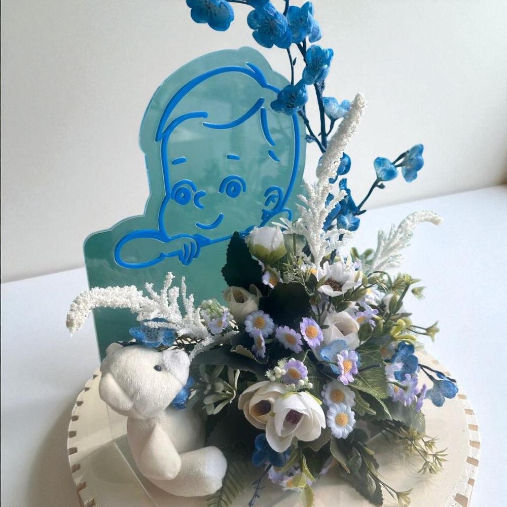 Отпразднуйте радость новых начинаний с акриловой композицией для мальчика — восхитительным сочетанием цветов, выглядящих как свежие, игривых деталей и очаровательного плюшевого мишки. Выполненная в успокаивающих голубых и белых тонах, эта композиция имеет акриловый стенд в виде мальчика в качестве центрального элемента, что делает её идеальным подарком для baby shower, посещений в больнице или чтобы поприветствовать новорождённого. Ручная работа от December Flower, эту композицию также можно настроить с акриловым стендом для девочки. Отпразднуйте радость новых начинаний с акриловой композицией для мальчика — восхитительным сочетанием цветов, выглядящих как свежие, игривых деталей и очаровательного плюшевого мишки. Выполненная в успокаивающих голубых и белых тонах, эта композиция имеет акриловый стенд в виде мальчика в качестве центрального элемента, что делает её идеальным подарком для baby shower, посещений в больнице или чтобы поприветствовать новорождённого. Ручная работа от December Flower, эту композицию также можно настроить с акриловым стендом для девочки.