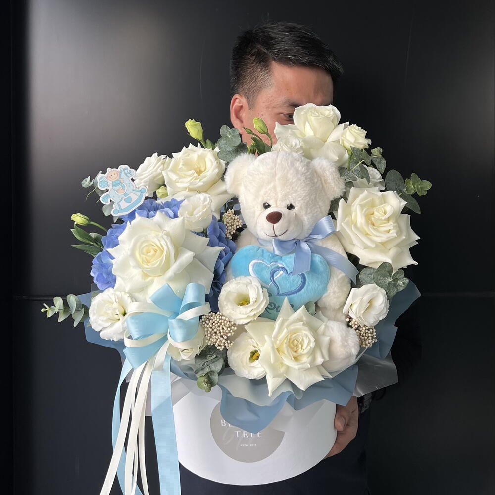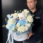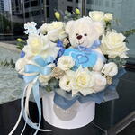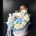 Композиция для новорожденного мальчика | Плюшевый мишка | Композиция в цветочной коробке | Белые и голубые цветы | Цветы для новорожденного