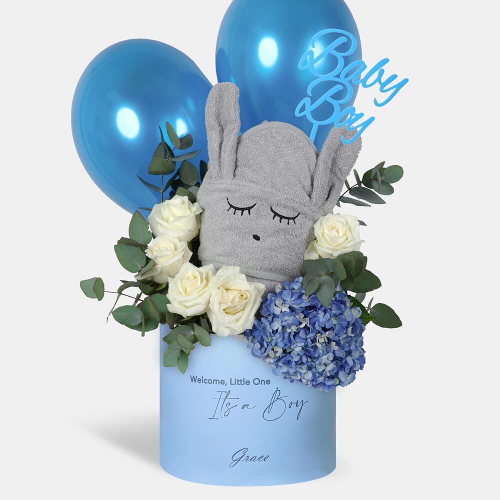 Отпразднуйте радость рождения мальчика с прекрасной подарочной корзиной, включающей полотенце Elli Junior Bunny и топпер для мальчика с миксом цветов: белой розы, голубой гортензии и эвкалипта a, это идеальный подарок, чтобы лелеять её очаровательные моменты.
