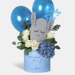 Eucalyptus - 1 шт. topper - 1 шт. hydrangea blue - 1 шт. baby towel - 1 шт. воздушные шары - 2 шт. white roses - 7 шт.