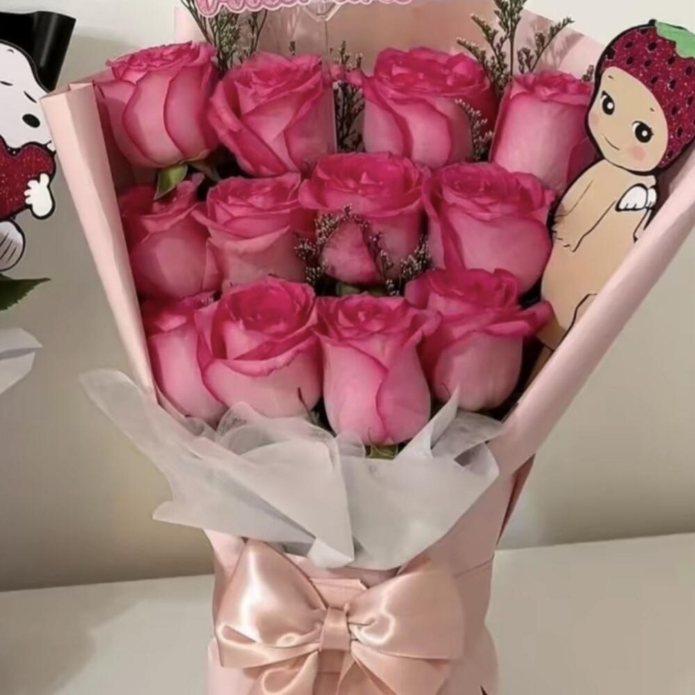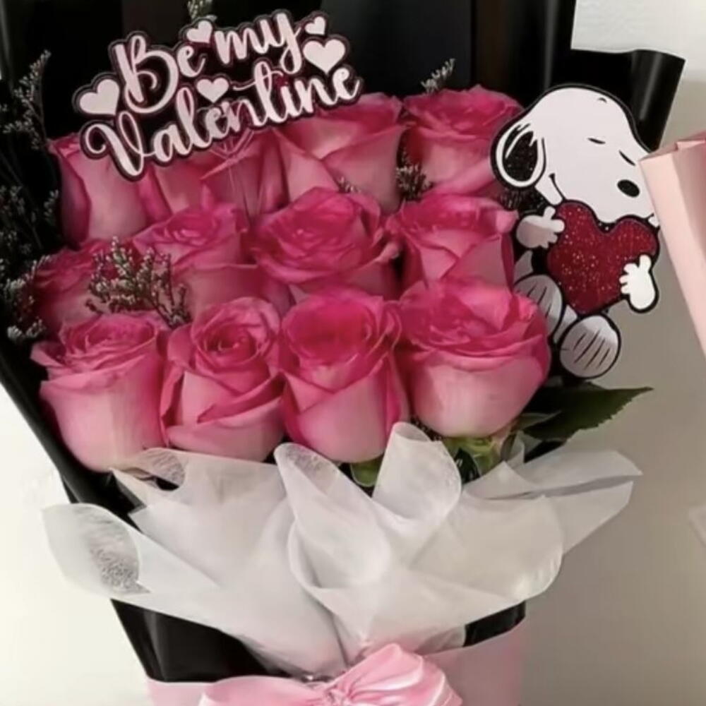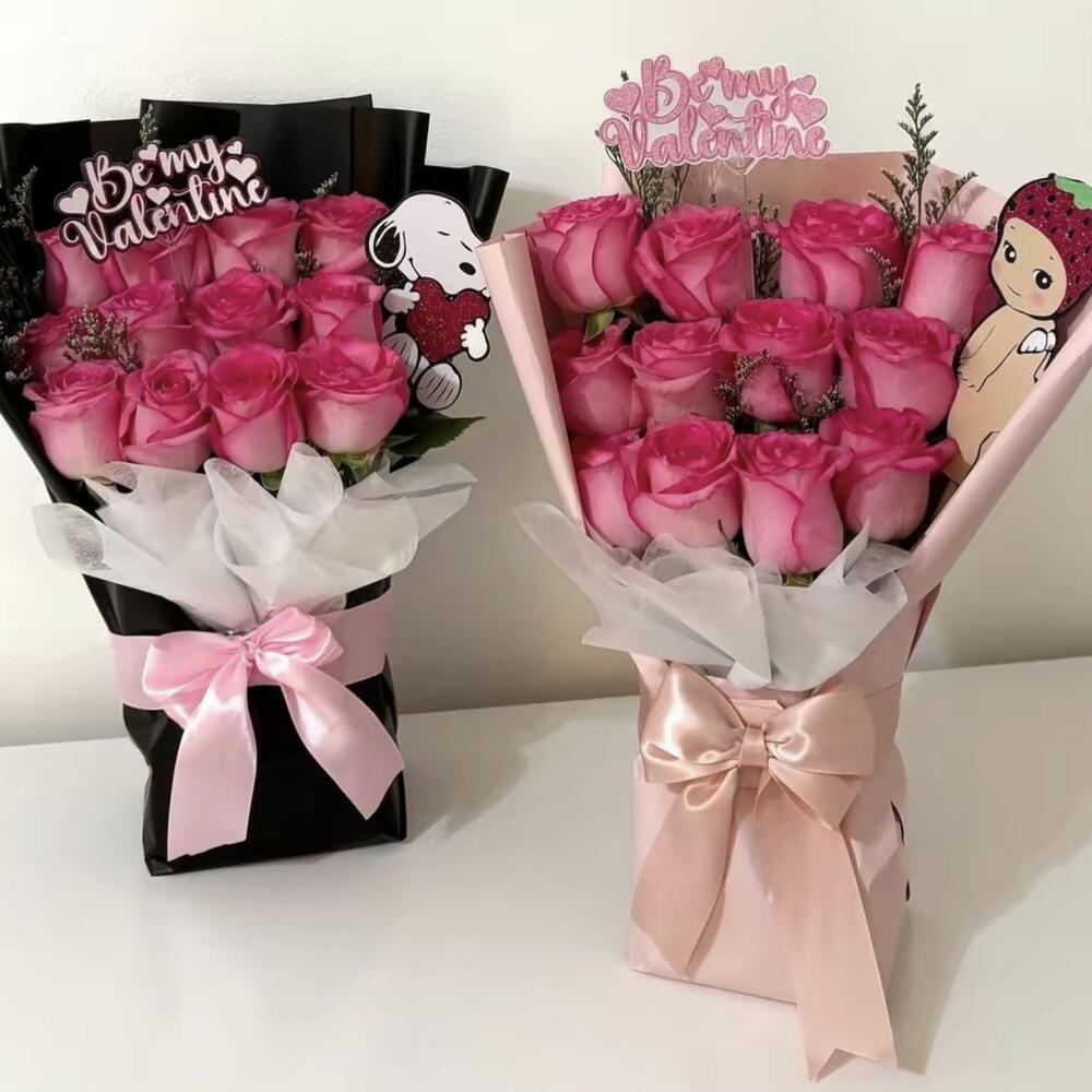 Левый букет: Этот букет завернут в черную упаковку с белым внутренним слоем. В нем множество розовых роз и он украшен большим розовым бантом. В качестве декора включены небольшая вырезная фигурка Снупи, держащая сердце, и табличка с надписью «Будь моим Валентином». Правый букет: Этот букет завернут в розовую упаковку с белым внутренним слоем и перевязан большим розовым бантом. В нем также множество розовых роз и он украшен табличкой с надписью «Будь моим Валентином» и мультяшной вырезной фигуркой персонажа, возможно вариацией Грута, в клубничной тематике.
