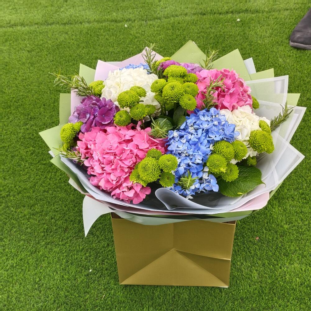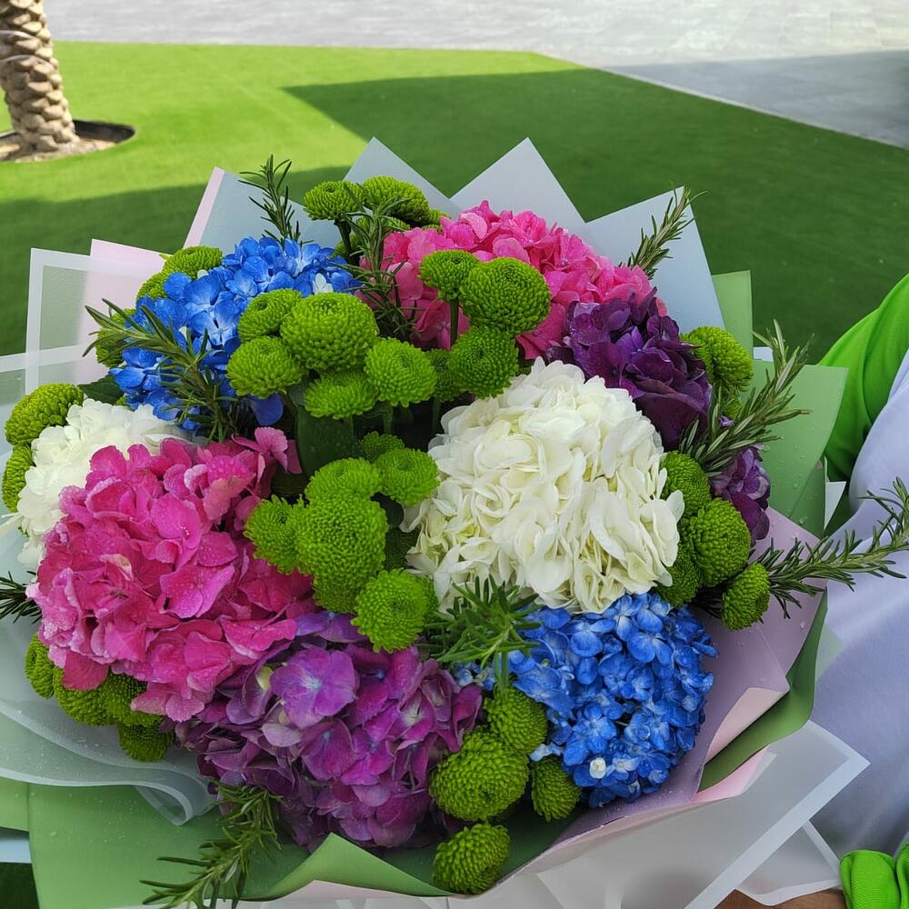 blue hydrangea - 2 шт. pink hydrangea - 2 шт. белые гортензии - 2 шт. микс-букет из гортензий - 1 шт. смесь зелени - 10 шт. микс гортензий - 2 шт.