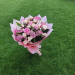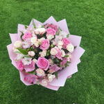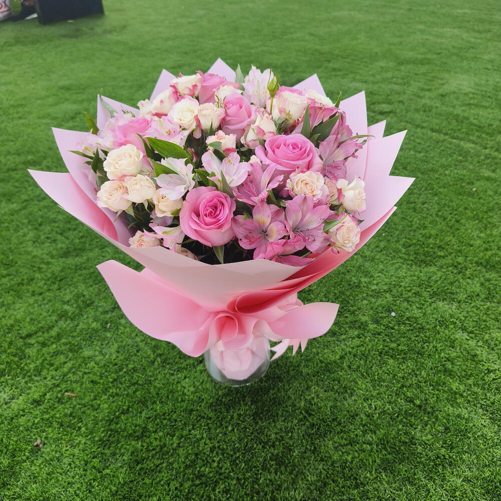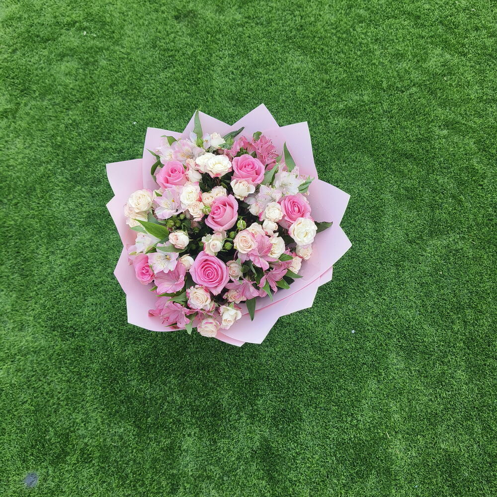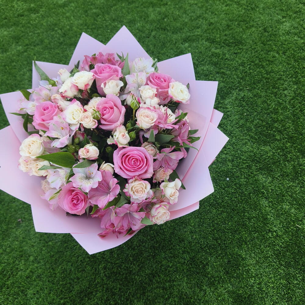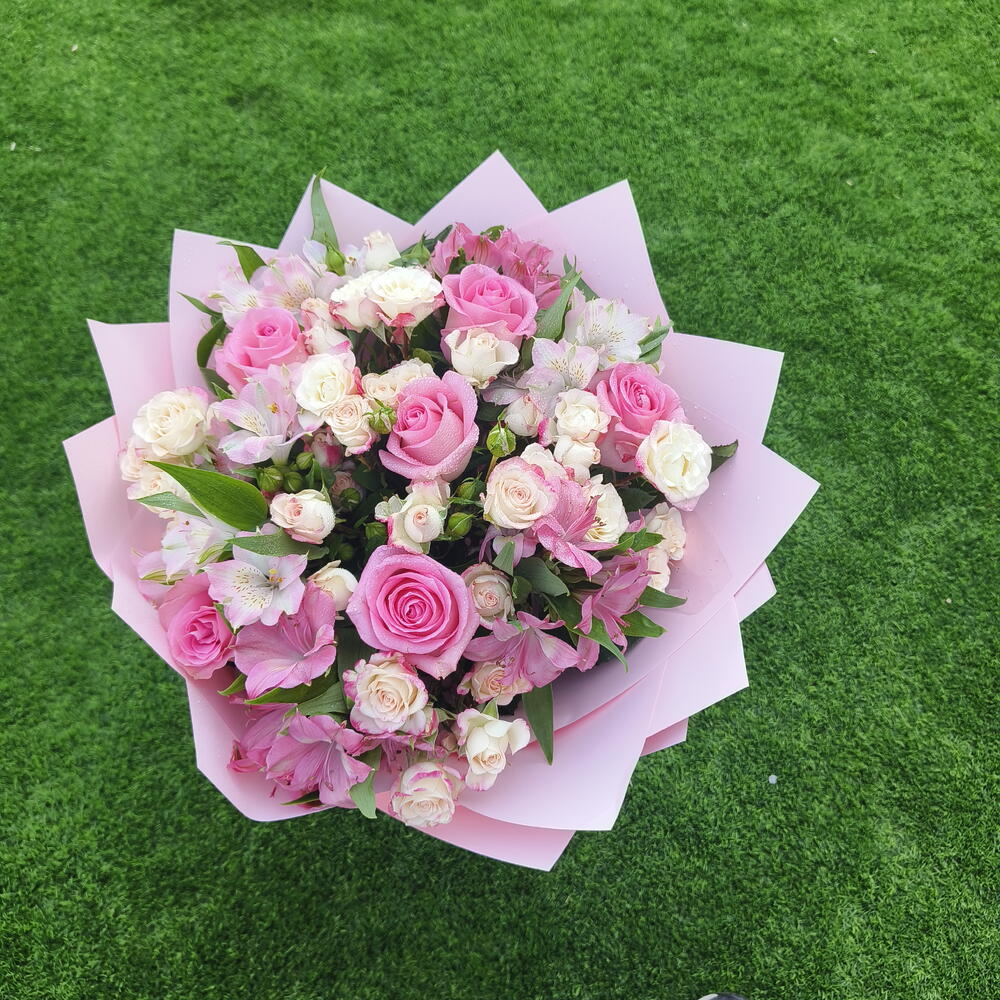 Pink rose - 5 шт. Gypsophila - 2 шт. alstroemerias - 5 шт. розовая мини-роза - 5 шт. стебли белых мини-роз - 2 шт.