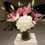 glass vase - 1 шт. white hydrangea - 1 шт. purple lisianthus - 6 шт. oriental lilies - 6 шт. желтые хризантемы - 3 шт. pink roses - 18 шт. желтые розы - 4 шт. белые/кремовые розы - 6 шт.