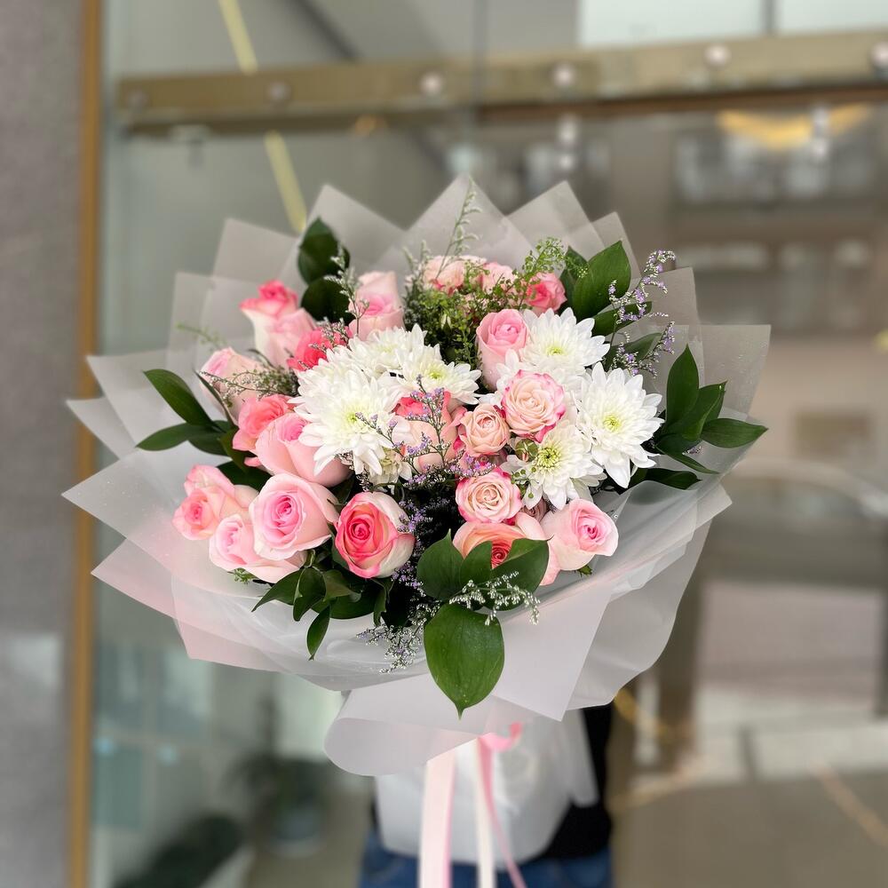 Limonium - 2 шт. Chrysanthemum - 2 шт. light pink rose - 8 шт. листья рускуса - 5 шт. двухтонная розовая роза - 8 шт. розовые спрей-розы - 2 шт. белое покрытие - 5 шт.