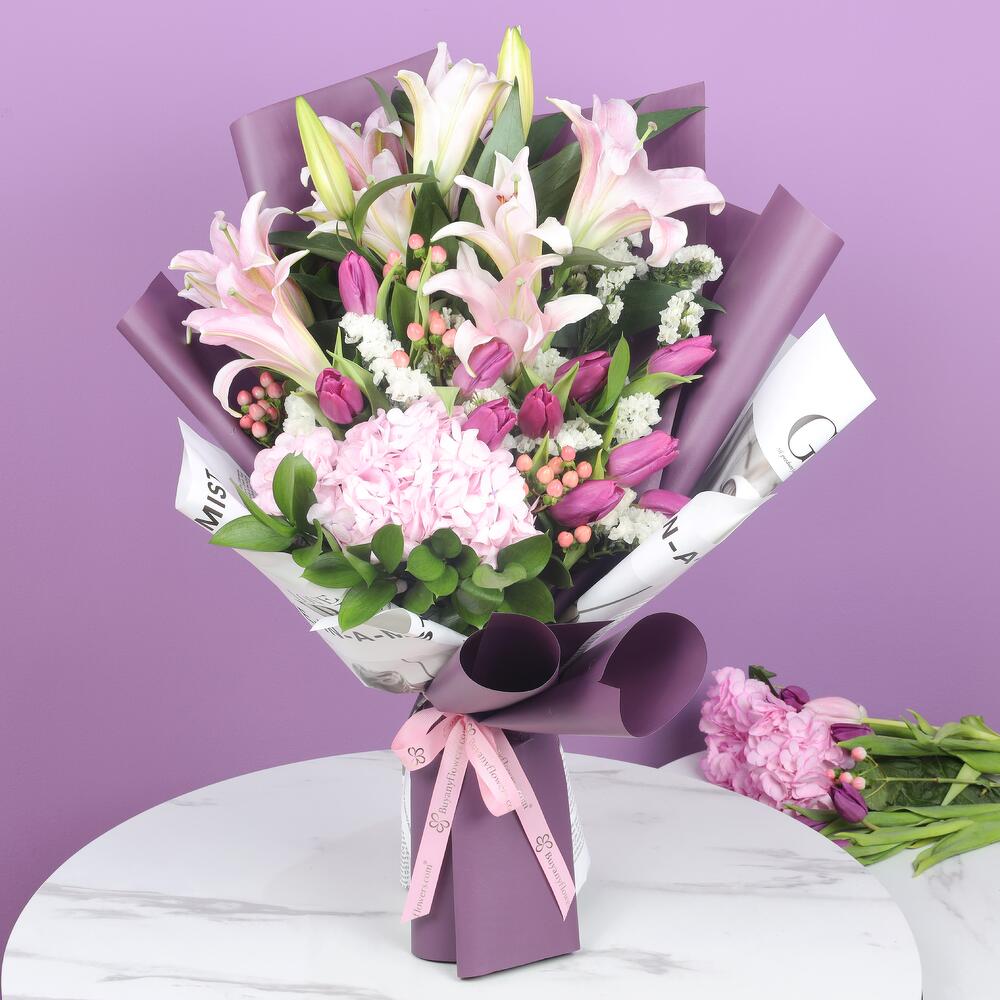 1 розовая гортензия, 3 розовые восточные лилии, 10 фиолетовых тюльпанов, 4 розовых гиперикума, 3 белых статицы, листья - 10 простых рускусов, красиво упакованные в белую любовную дымку и фиолетовую упаковку, перевязанные розовой лентой.