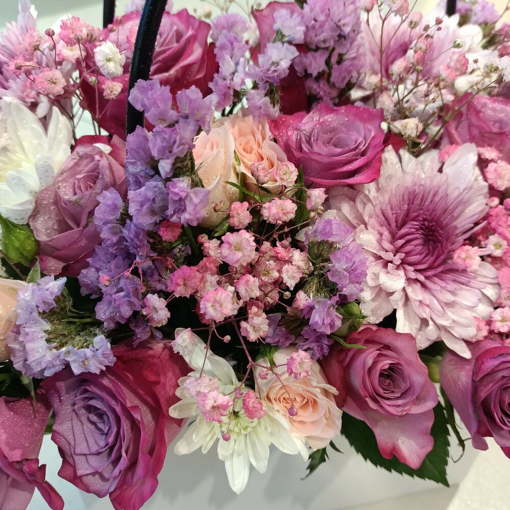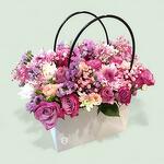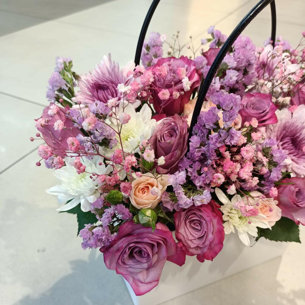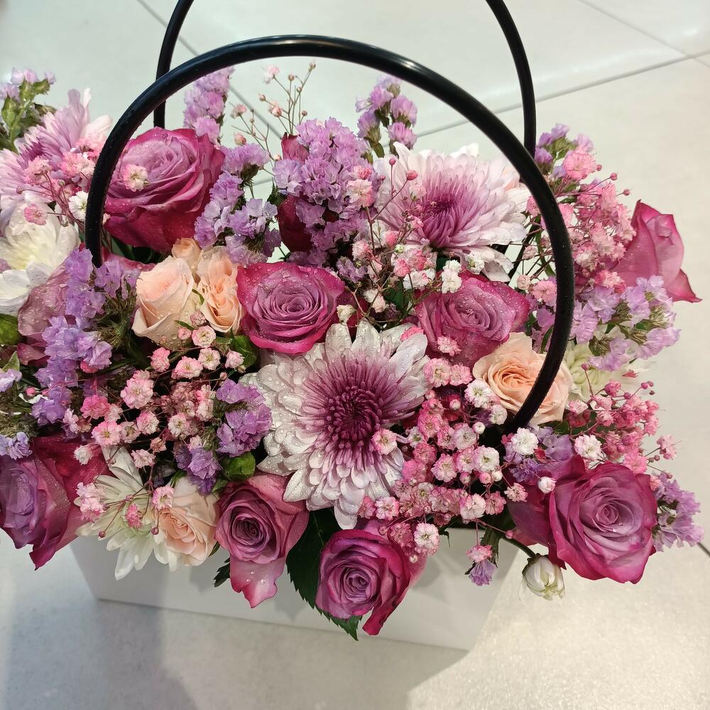Потрясающая и яркая цветочная композиция, представленная в стильной белой прямоугольной коробке с элегантными черными петлевыми ручками. Она переполнена чарующим сочетанием свежих цветов в различных оттенках розового, фиолетового и лавандового, включая розы, хризантемы и нежные наполняющие цветы, создавая по-настоящему восхитительную и завораживающую композицию.