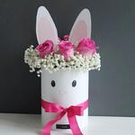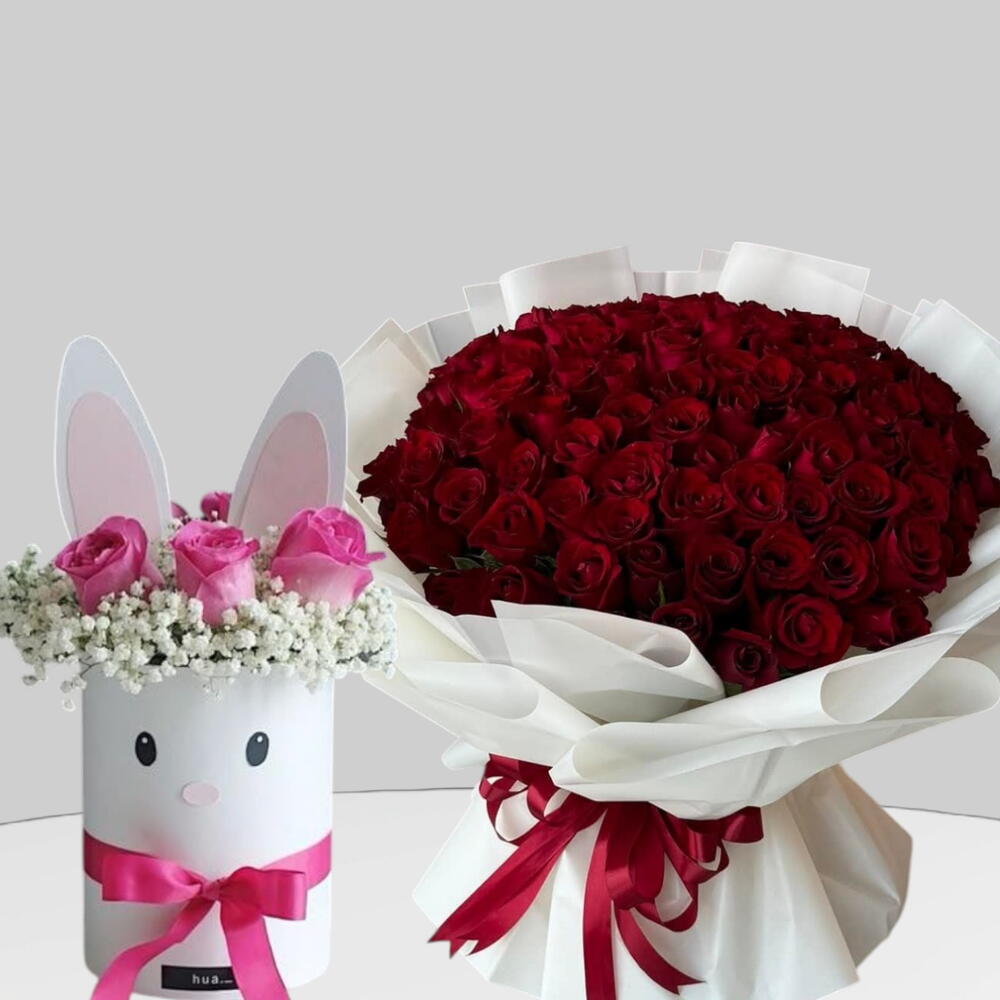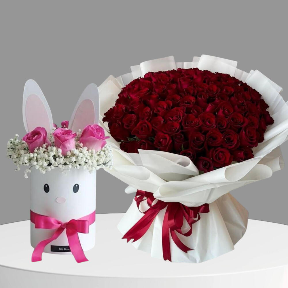 Основной букет: в большом букете множество премиальных красных роз, которые являются вечным символом любви, страсти и красоты. Композиция создана, чтобы выразить глубокие чувства и романтику. Меньшая композиция: слева представлена меньшая, очаровательная композиция из розовых роз и гипсофилы в белом контейнере с нежным изображением мордочки кролика и розовой ленточкой.