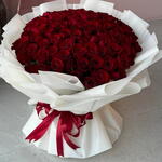 Red rose - 101 шт. Red ribbon - 1 шт. Pink ribbon - 1 шт. Gypsophila - 5 шт. white box - 1 шт. мягкая розовая роза - 9 шт.