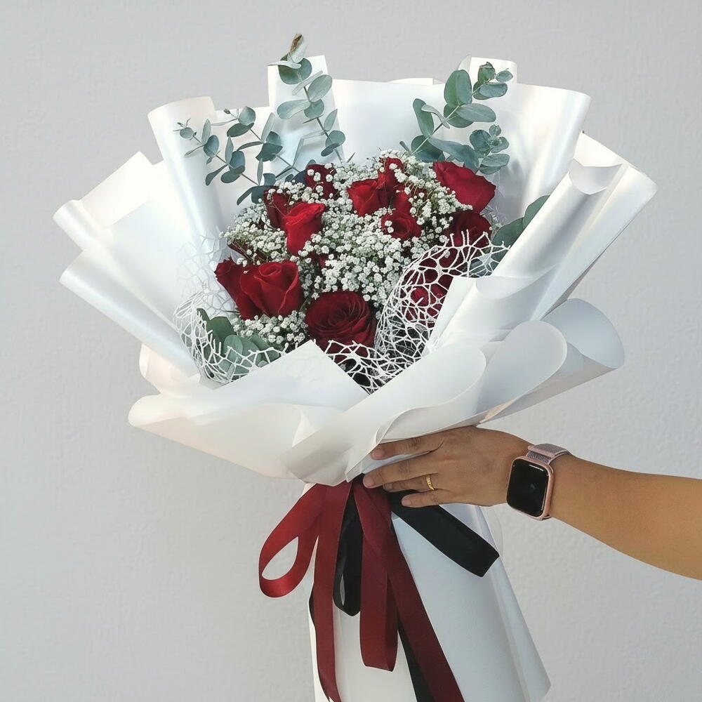 Этот элегантный букет включает 17 насыщенных красных роз, символизирующих любовь и страсть, красиво оформленных с деликатной гипсофилой для мягкого, воздушного эффекта. Свежие листья эвкалипта добавляют нотку зелени, усиливая общий вид своим тонким контрастом. Завёрнутый в хрустящую белую бумагу и перевязанный красными и чёрными ленточками, этот букет излучает утонченность и шарм, делая его идеальным выбором для романтических случаев, годовщин или просто чтобы выразить восхищение. Современный дизайн и свежие цветы делают его вневременным подарком, который обязательно произведёт впечатление. Для ухода регулярно меняйте воду и подрезайте стебли примерно на 1 см каждые несколько дней, чтобы розы оставались свежими. Храните букет в прохладном месте, вдали от прямых солнечных лучей, чтобы сохранить его красоту.