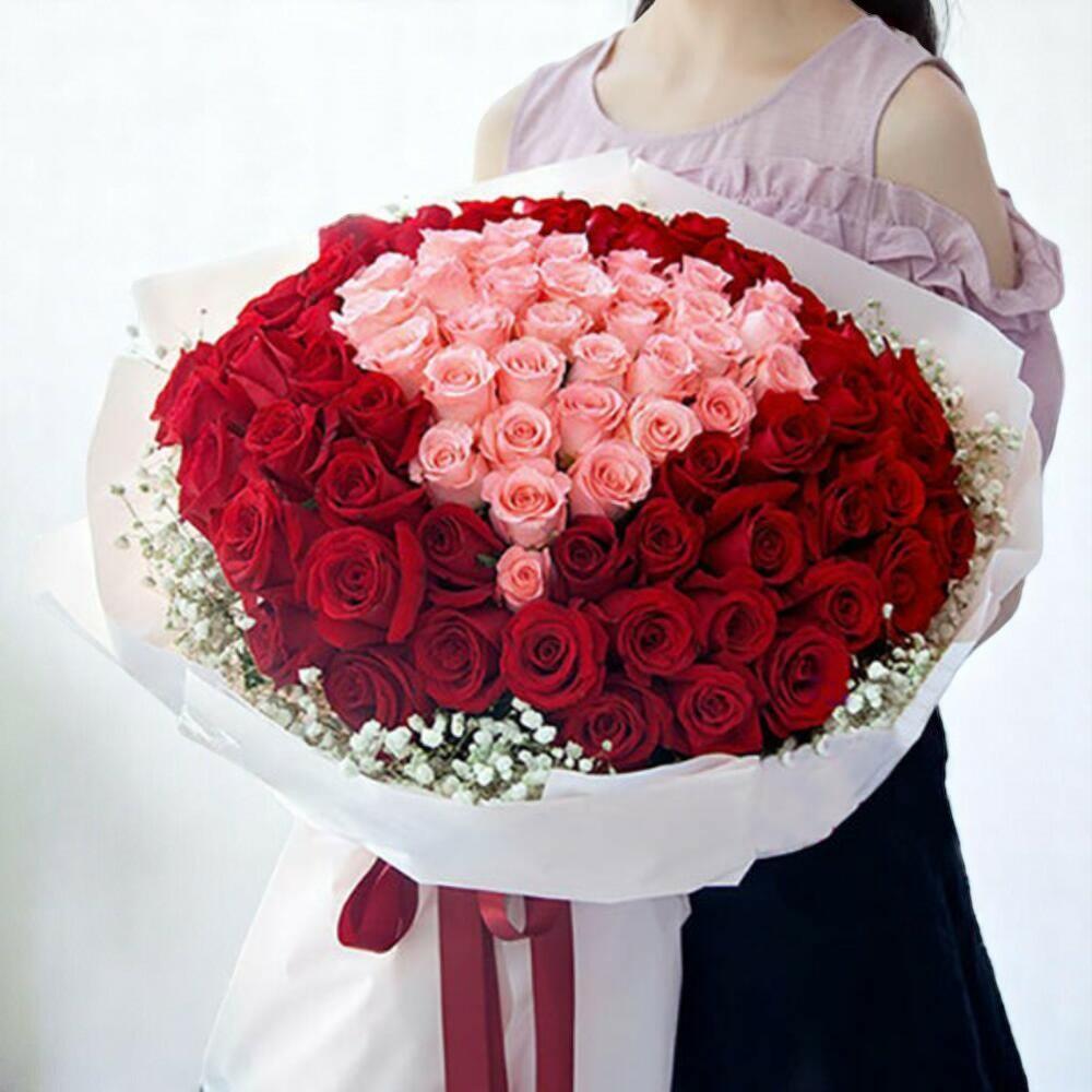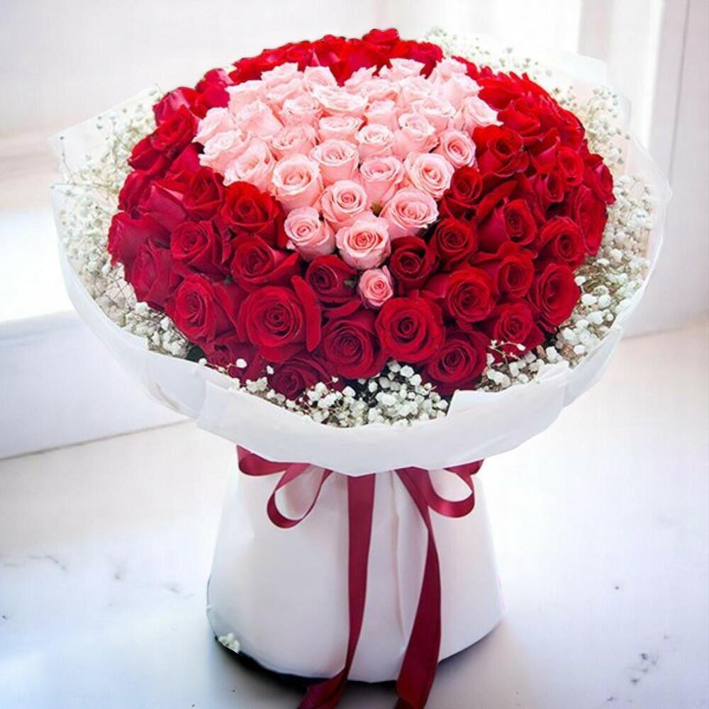 Большой сладкий сердечный букет – композиция из 100 роз в форме сердца с розовыми и красными розами