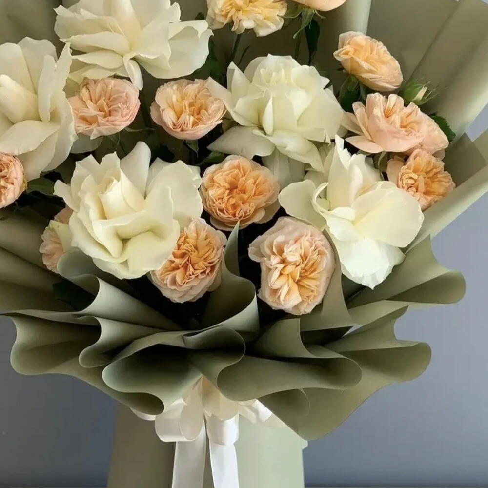 Букет представляет собой смесь крупных кремово-белых цветов и более мелких персиковых цветков, возможно гвоздик и роз. Цветы уложены в округлую форму и завернуты в плиссированную мятно-зелёную бумагу, перевязанную простой белой лентой. Небольшая пустая белая карточка заправлена в верхнюю часть композиции.