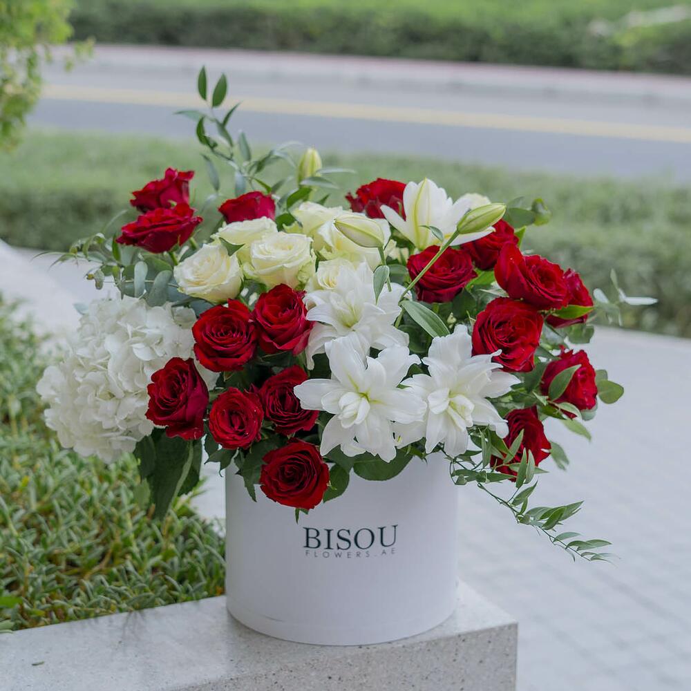 Композиция в белой коробке из 20 стеблей красных роз, 5 стеблей белых роз, 1 стебля белой гортензии и 3 стеблей белых лилий.