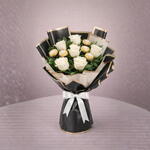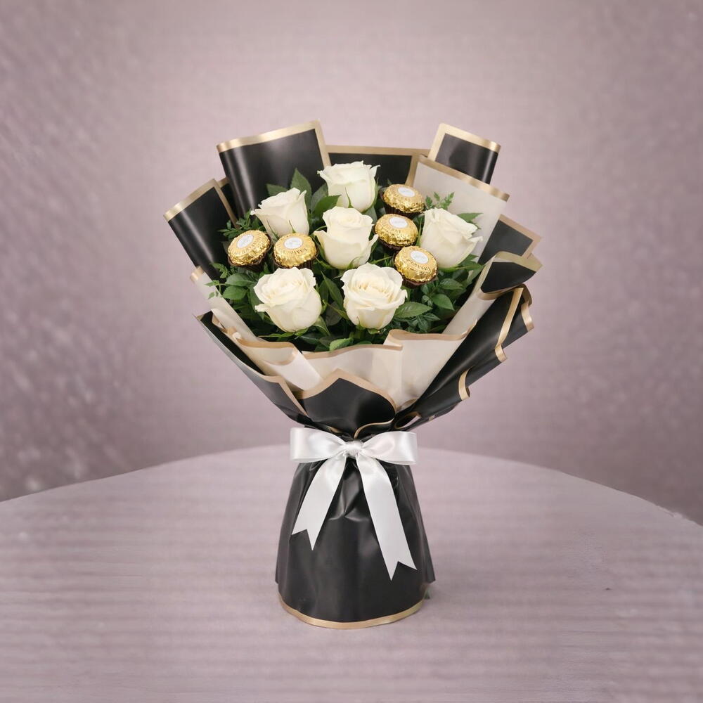6 свежих белых роз в комплекте с 5 конфетами Ferrero Rocher, красиво упакованы для лаконичного и элегантного подарка.