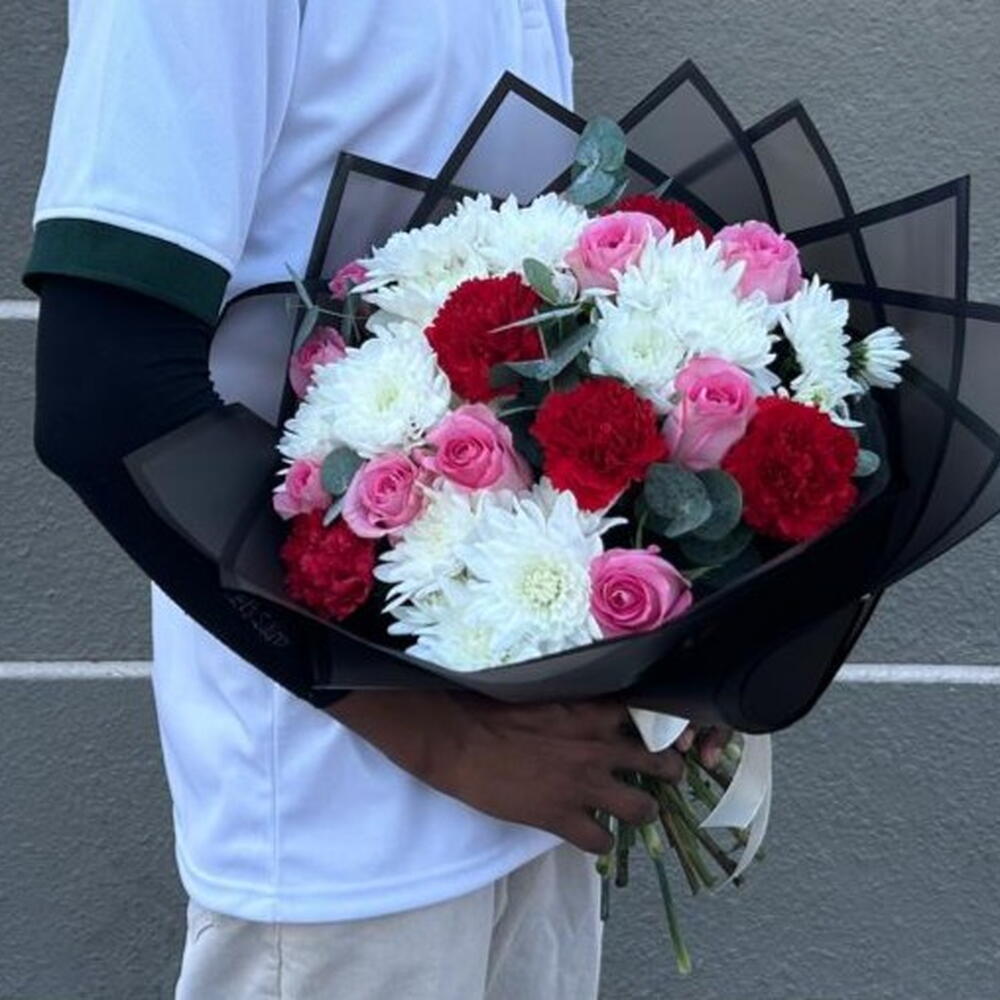 Этот очаровательный букет от флориста – настоящее произведение искусства, сочетающее в себе изысканное цветочное великолепие. Композиция состоит из пяти роскошных красных гвоздик, десяти захватывающих дух розовых роз и четырёх девственно-белых хризантем, изысканно украшенных тремя веточками свежих листьев эвкалипта. Чтобы подчеркнуть роскошь и внимание к деталям, букет бережно упакован в четыре слоя высококачественной упаковочной бумаги, создавая настоящий шедевр, который всегда производит неизгладимое впечатление. Этот букет идеально подходит для любого случая – от простого признания в любви до грандиозного торжества.