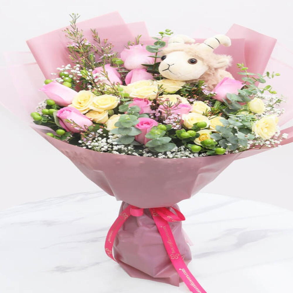 1 плюшевая игрушка «Овечка» 20 см, 10 розовых роз, 5 веточек персиковых мини-роз, 3 зеленых зверобоя, 1 стебель розового воскового цветка, листья - 2 веточки эвкалипта, наполнитель - 1 веточка перекати-поле, упаковано в фиолетовую и розовую бумагу, перевязано темно-розовой лентой.