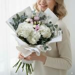 Spray rose - 2 шт. Hydrangea - 3 шт. Wrapping - 4 шт. лизиантус - 2 шт.