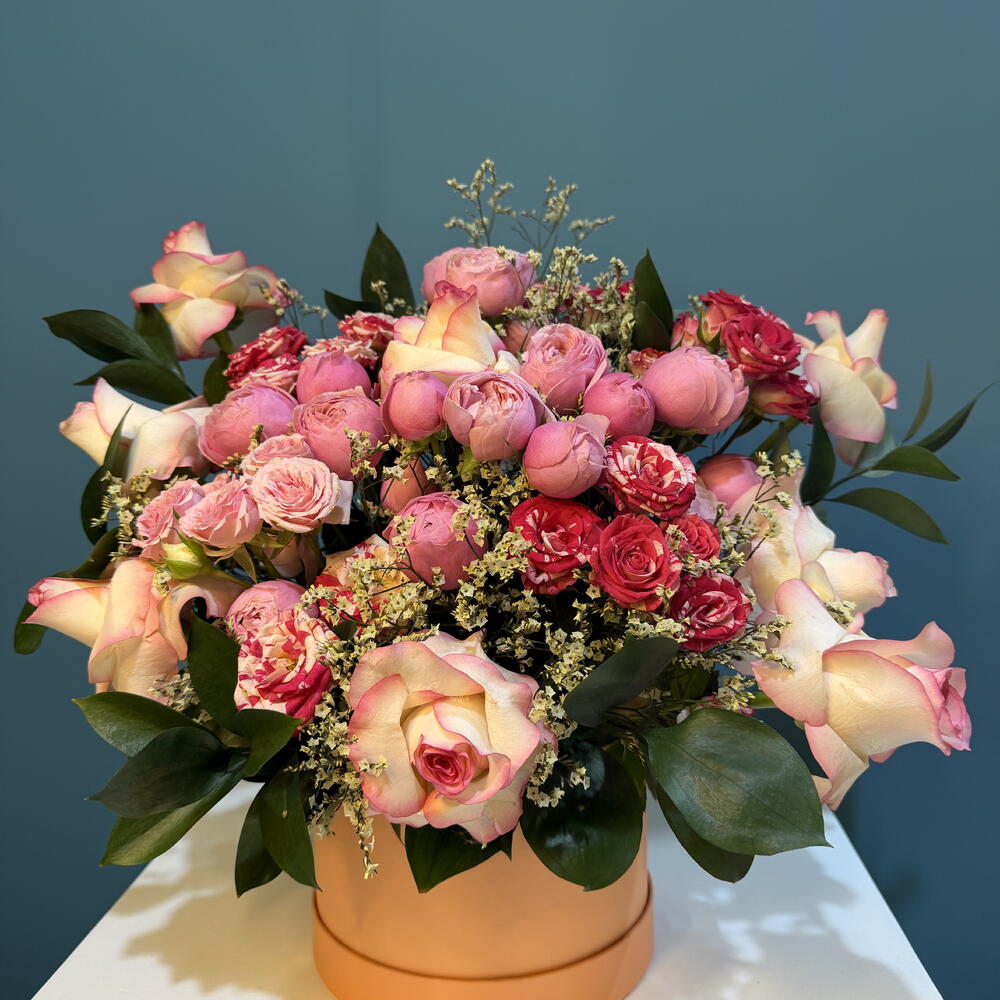 Пышная, полная композиция, наполненная оттенками розового. Rosébloom сочетает премиальные розы розового цвета, спрей-розы, ранункулюсы, гвоздики и мягкие наполнители в тёплой персиковой шляпной коробке — создавая романтичную, женственную и красиво округлую цветочную композицию.