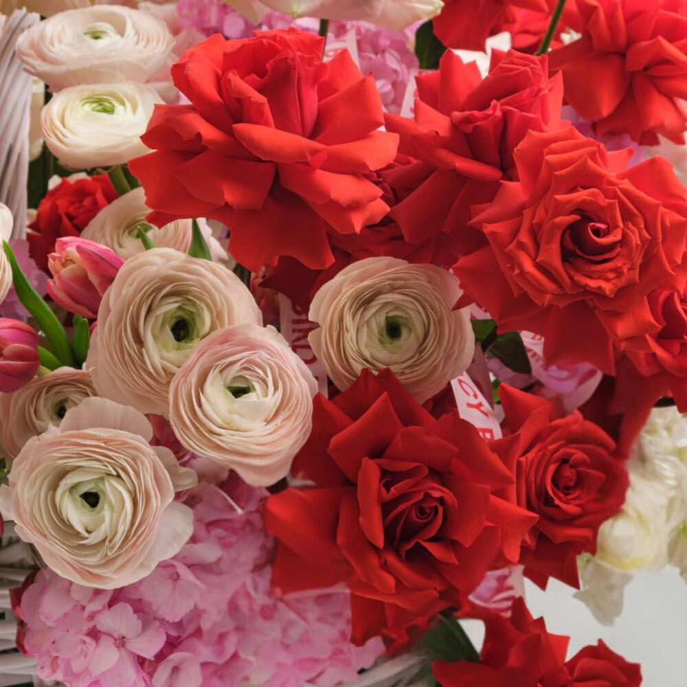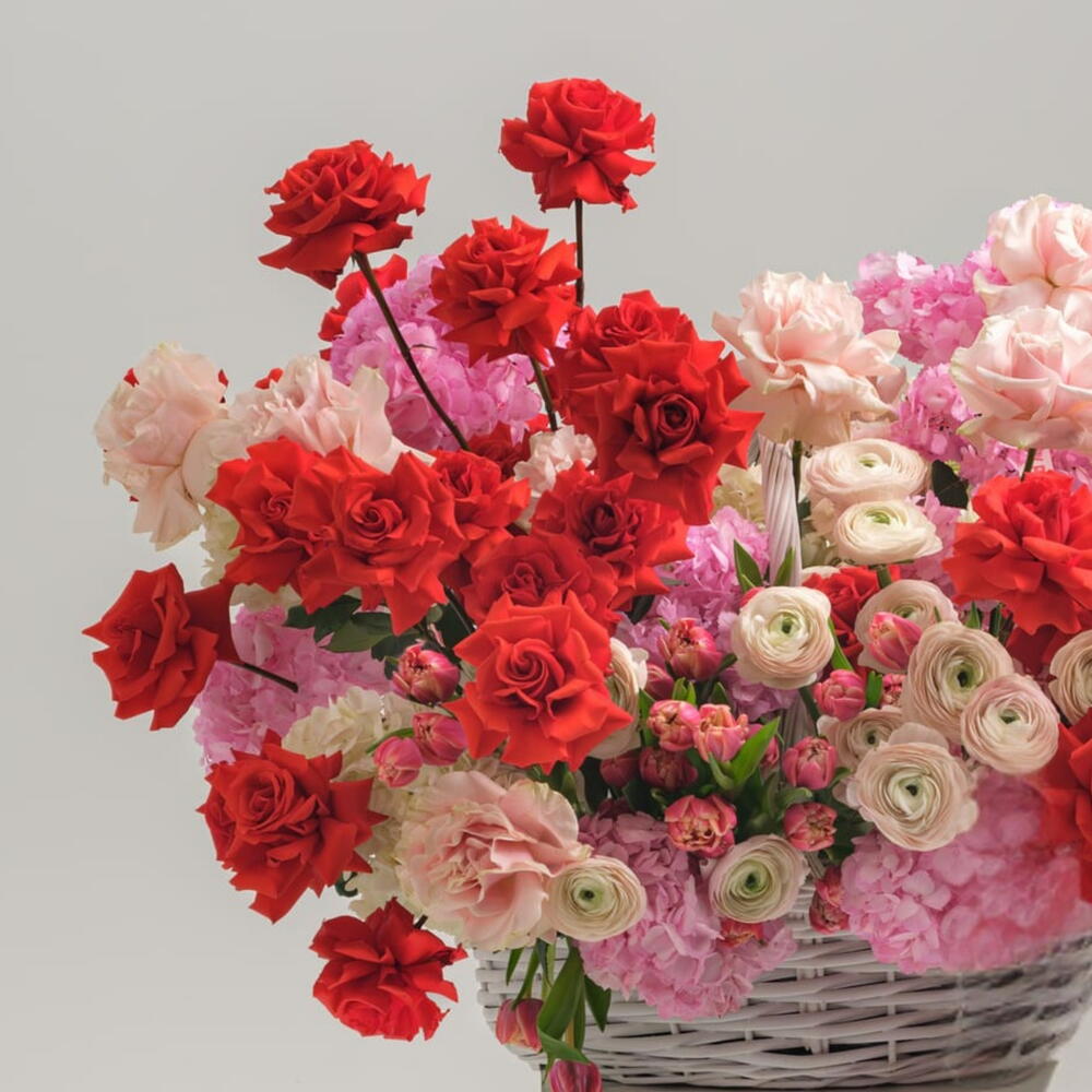 Bloom Overload – Роскошная XL цветочная корзина с гортензией, красной розой, ранункулюсом и тюльпанами