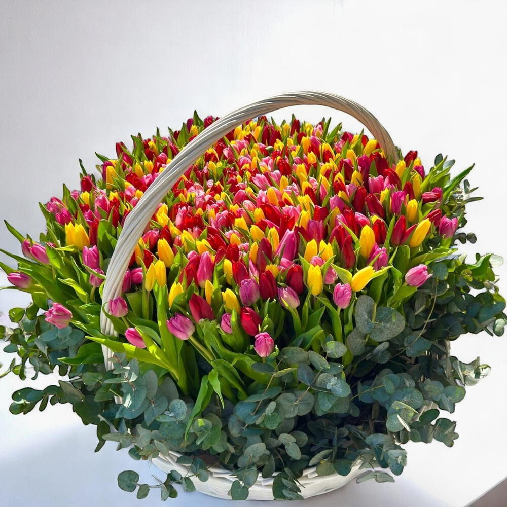 Эта корзина разноцветных тюльпанов, словно яркий взрыв весенней радости, воплощает в себе суть счастья и обновления. Эта великолепная цветочная композиция, состоящая из сотен ярких тюльпанов красных, жёлтых, розовых и фиолетовых оттенков, обрамлена свежей зеленью эвкалипта, придающей ей нотку естественной элегантности. Очаровательная белая плетёная корзина с ручкой идеально подходит для праздников, тёплых поздравлений или создания незабываемых впечатлений. Чтобы тюльпаны дольше оставались свежими, поместите корзину в прохладное место, вдали от прямых солнечных лучей и источников тепла. Слегка опрыскивайте композицию и подрезайте кончики стеблей каждые 2–3 дня, если она находится в пропитанной водой губке.