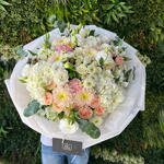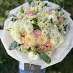 pink carnations - 3 шт. white chrysanthemum - 4 шт. white lisianthus - 4 шт. Свит Сара кустовая роза - 4 шт. ветки эвкалипта - 4 шт. белый цветок гортензии - 3 шт. белая альстромерия - 4 шт. белые помпонные хризантемы - 3 шт.