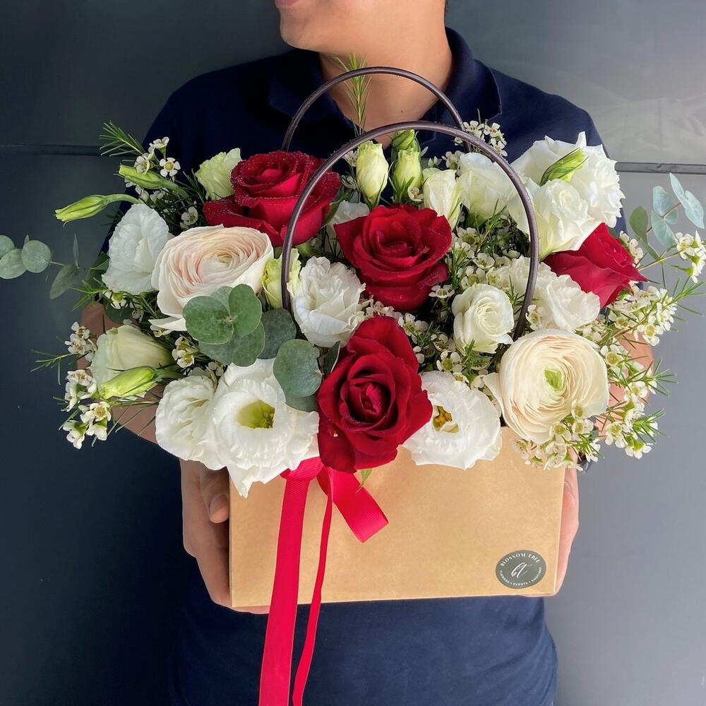 Red rose - 5 шт. Wax flowers - 3 шт. Eucaliptus - 2 шт. Eustoma white - 5 шт. ranunculus - 2 шт.