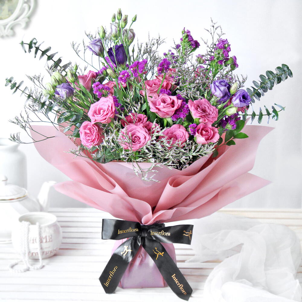 Statice - 4 шт. Eucalyptus - 2 шт. Limonium - 1 шт. Lisianthus - 2 шт. roses - 16 шт.