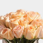 Коллекция из тридцати пяти персиковых роз, оформленная с грацией и заботой. Сбалансированное сочетание утончённости и природной красоты.