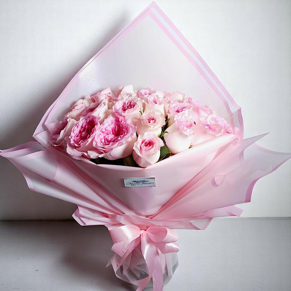 Этот премиальный букет из розовых роз – воплощение элегантности в нежной пастельной упаковке, идеально подходящий для тех, кто ценит классическую романтику и роскошь. Букет состоит из премиальных розовых садовых роз (розовые розы пионовидной формы с многослойными лепестками) в сочетании с нежно-розовыми розами, создавая пышный, воздушный букет, который выглядит так же красиво вживую, как и на фотографиях. Упакованный в шикарную нежно-розовую упаковку, это вневременной свежий букет из цветов премиум-класса. Этот букет – лучший выбор для любителей букетов на день рождения и, безусловно, один из лучших вариантов букета на день рождения. Он также идеально подходит для романтических подарков, подарков на годовщину и даже в качестве изящного поздравительного букета. Если вы ищете цветы на день рождения или просто лучший букет в Дубае, этот премиальный букет подарит вам незабываемые впечатления с момента доставки.