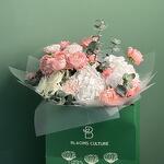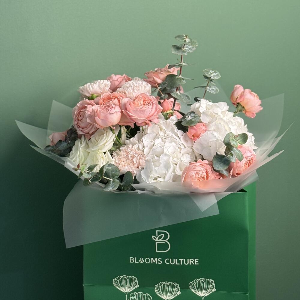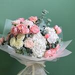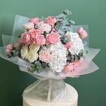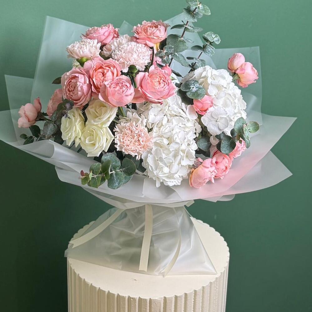 Hydrangea - 2 шт. carnation - 5 шт. eucalyptus leaves - 3 шт. кустовая роза Джульетта - 3 шт. кустовая роза белая бумбастик - 2 шт.