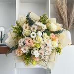 Eucalyptus - 4 шт. Solidago - 4 шт. Lisianthus - 4 шт. white roses - 4 шт. белая хризантема - 4 шт.