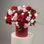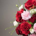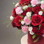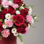 Eustoma white - 3 шт. carnation pink - 8 шт. thlaspi - 2 шт. красная кустовая роза - 5 шт. red roses - 6 шт. бордовый - 1 шт.