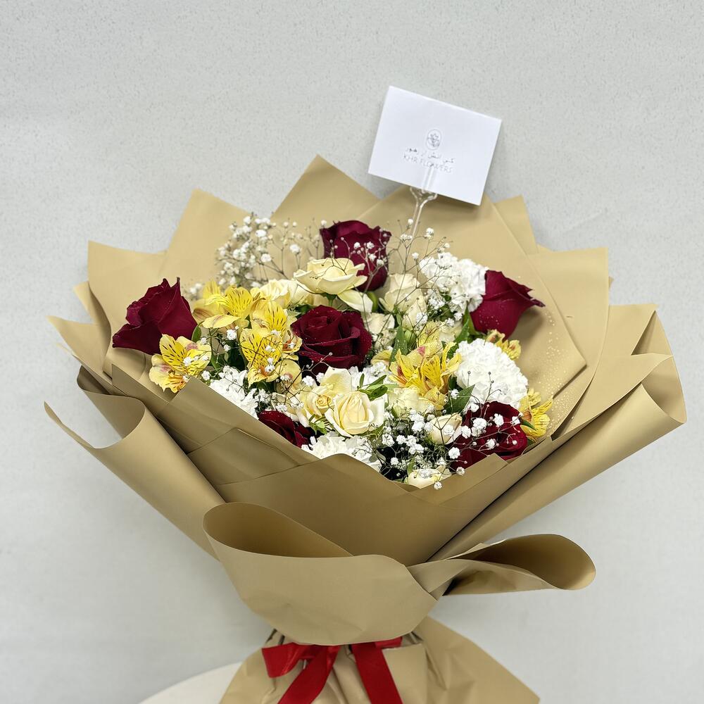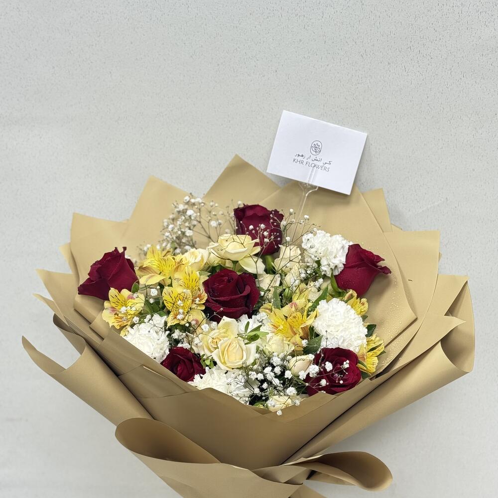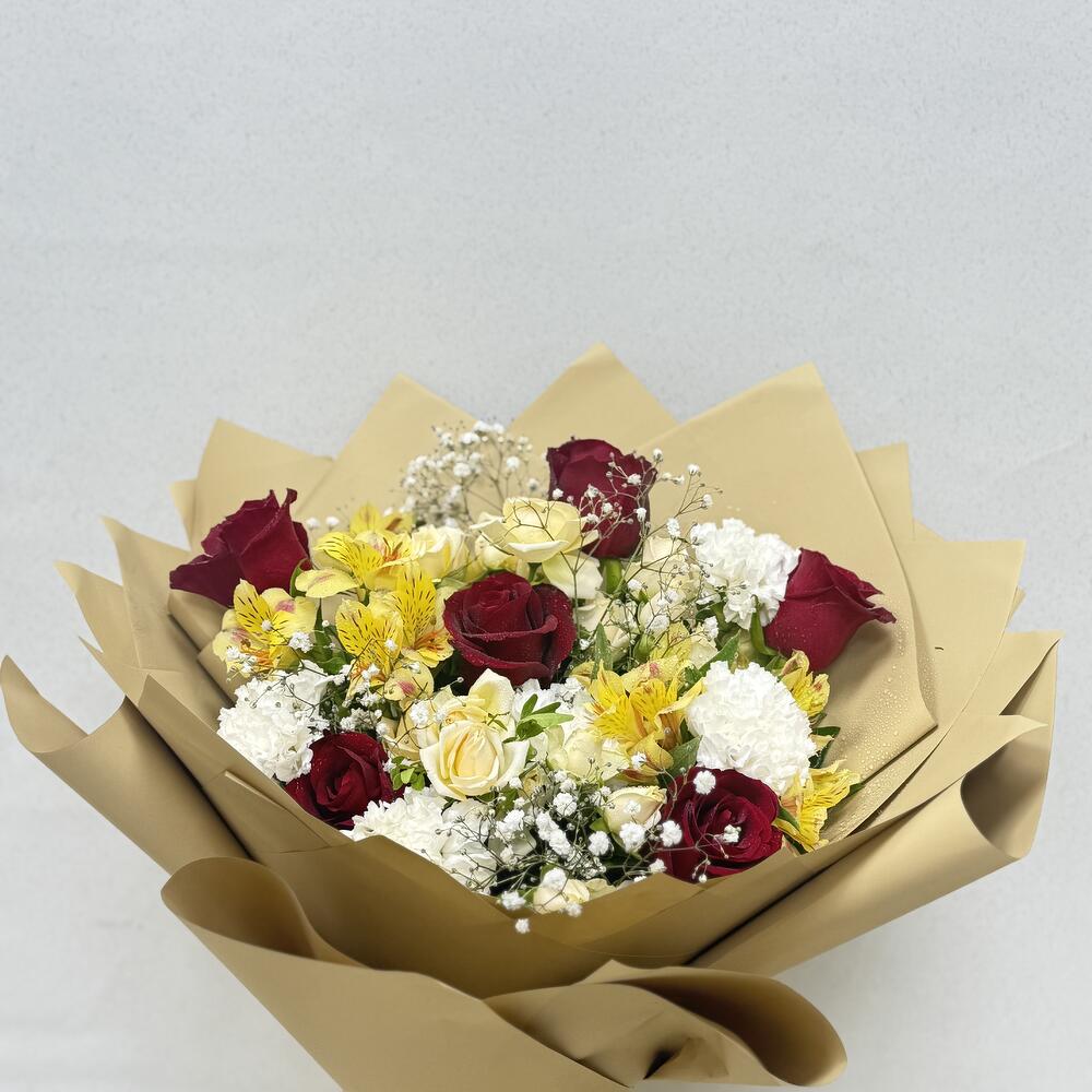 carnation white - 6 шт. мини роза персиковая - 4 шт. red roses - 6 шт. альстромерия жёлтая - 3 шт.
