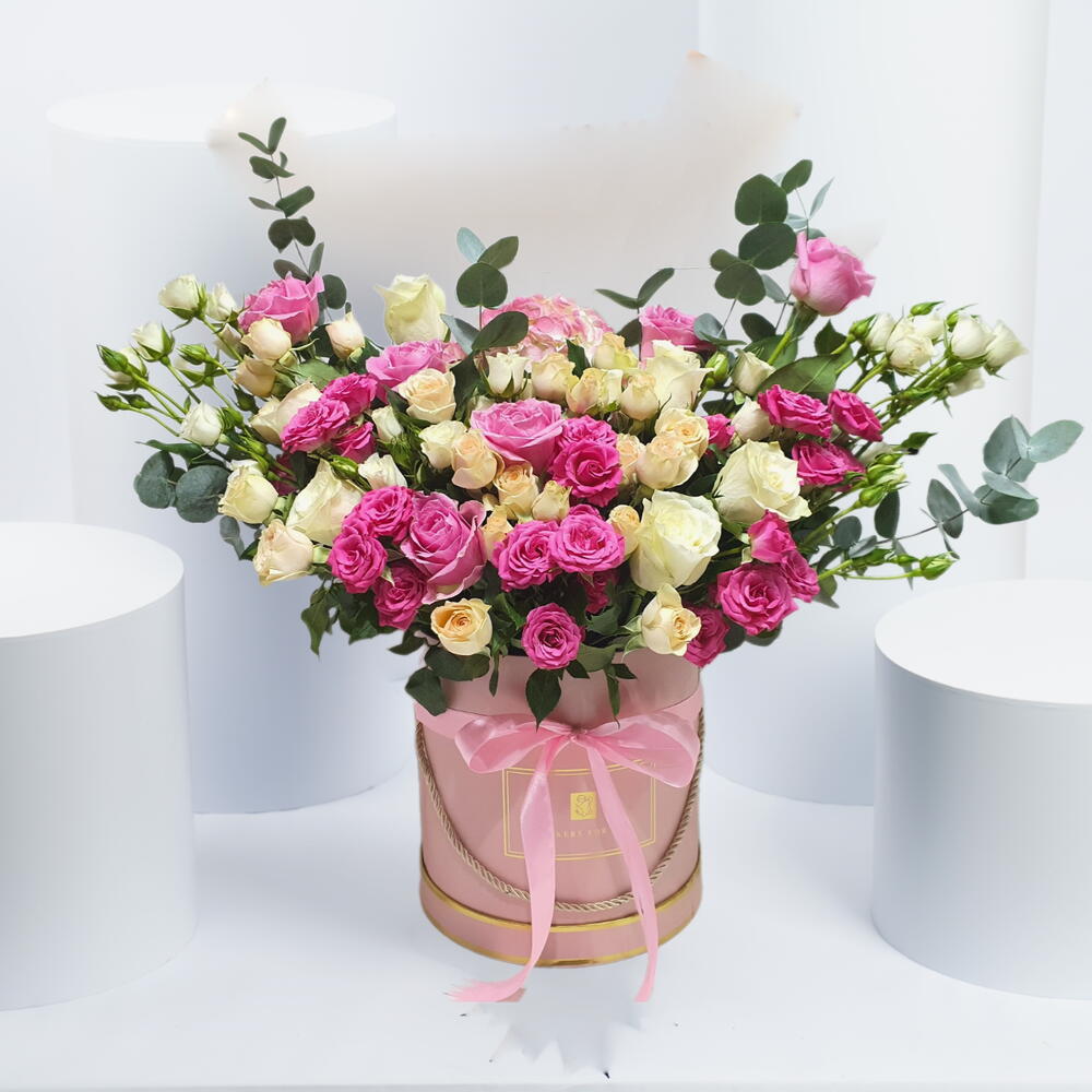 персиковые кустовые розы - 6 шт. pink roses - 8 шт. white roses - 8 шт. тёмно-розовые кустовые розы - 3 шт. эвкалипт - 4 шт. фисташка - 4 шт.