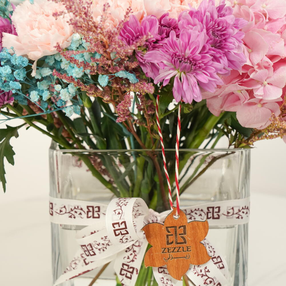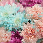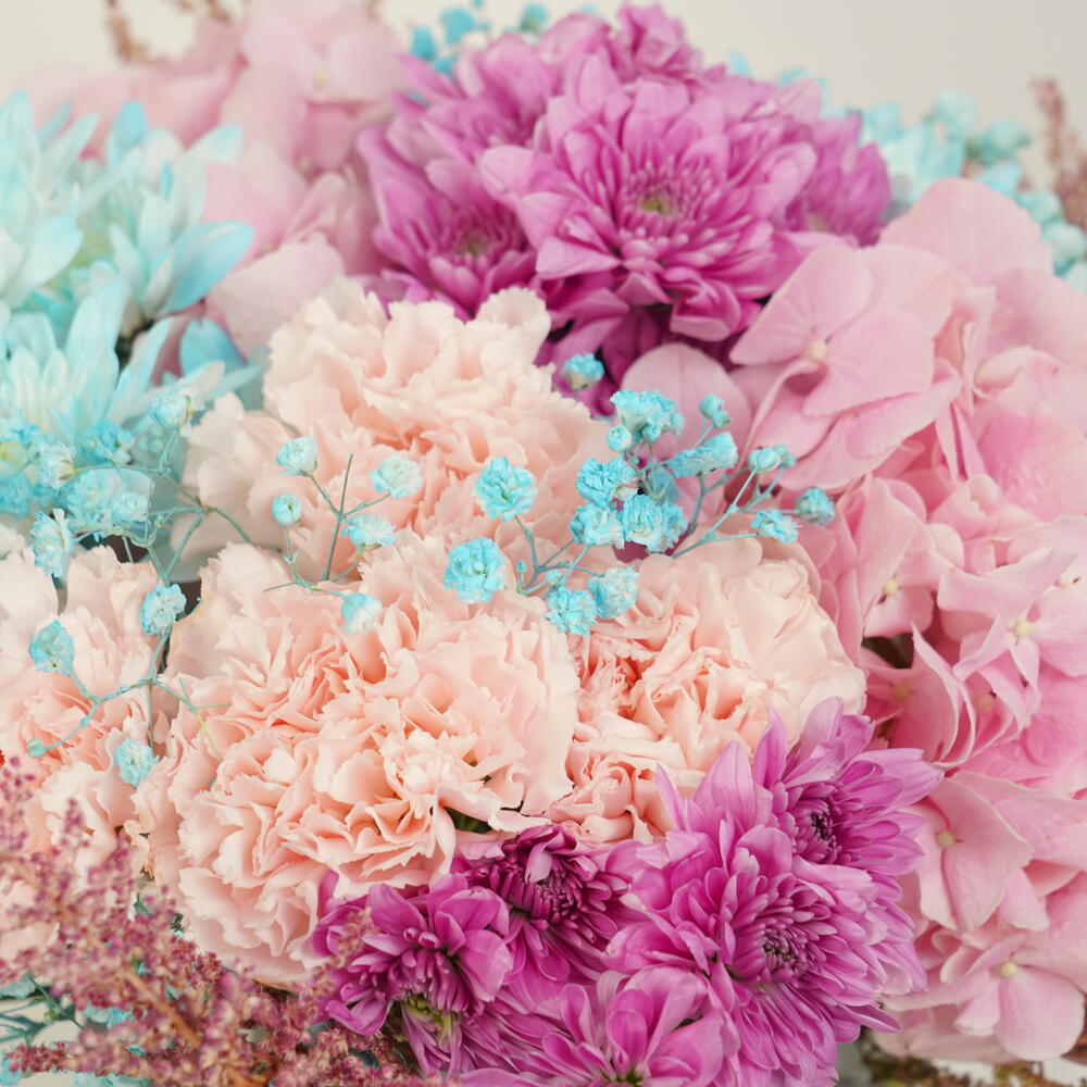Очаровательная композиция с 2 розовыми гортензиями, 5 розовыми гвоздиками, 3 розовыми астильбами и эффектными синими хризантемами, красиво оформленная в квадратной стеклянной вазе. Blossom Charm сочетает яркую элегантность с нежной романтикой, идеально подходит для подарка и особых случаев.