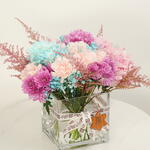 hydrangea pink - 2 шт. carnation pink - 5 шт. розовая астильба - 5 шт. синяя гипсофила - 5 шт. квадратная ваза - 1 шт. фиолетовые хризантемы - 5 шт.