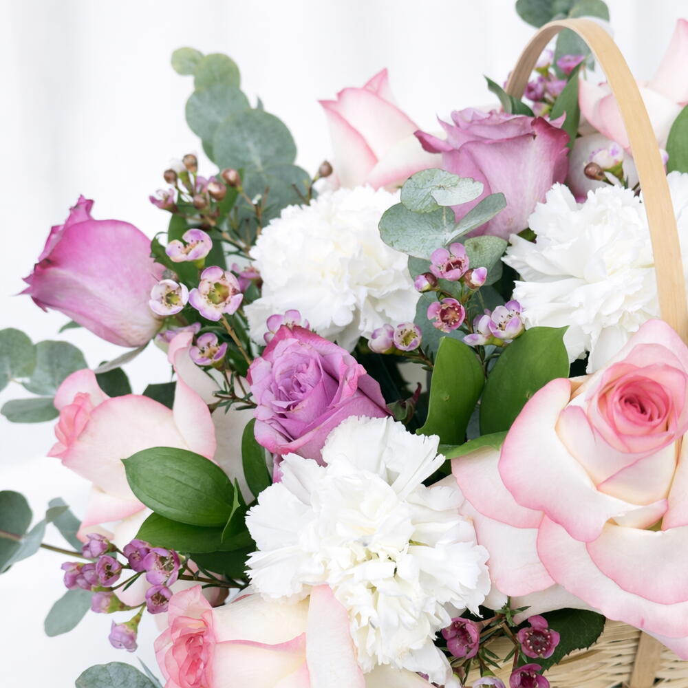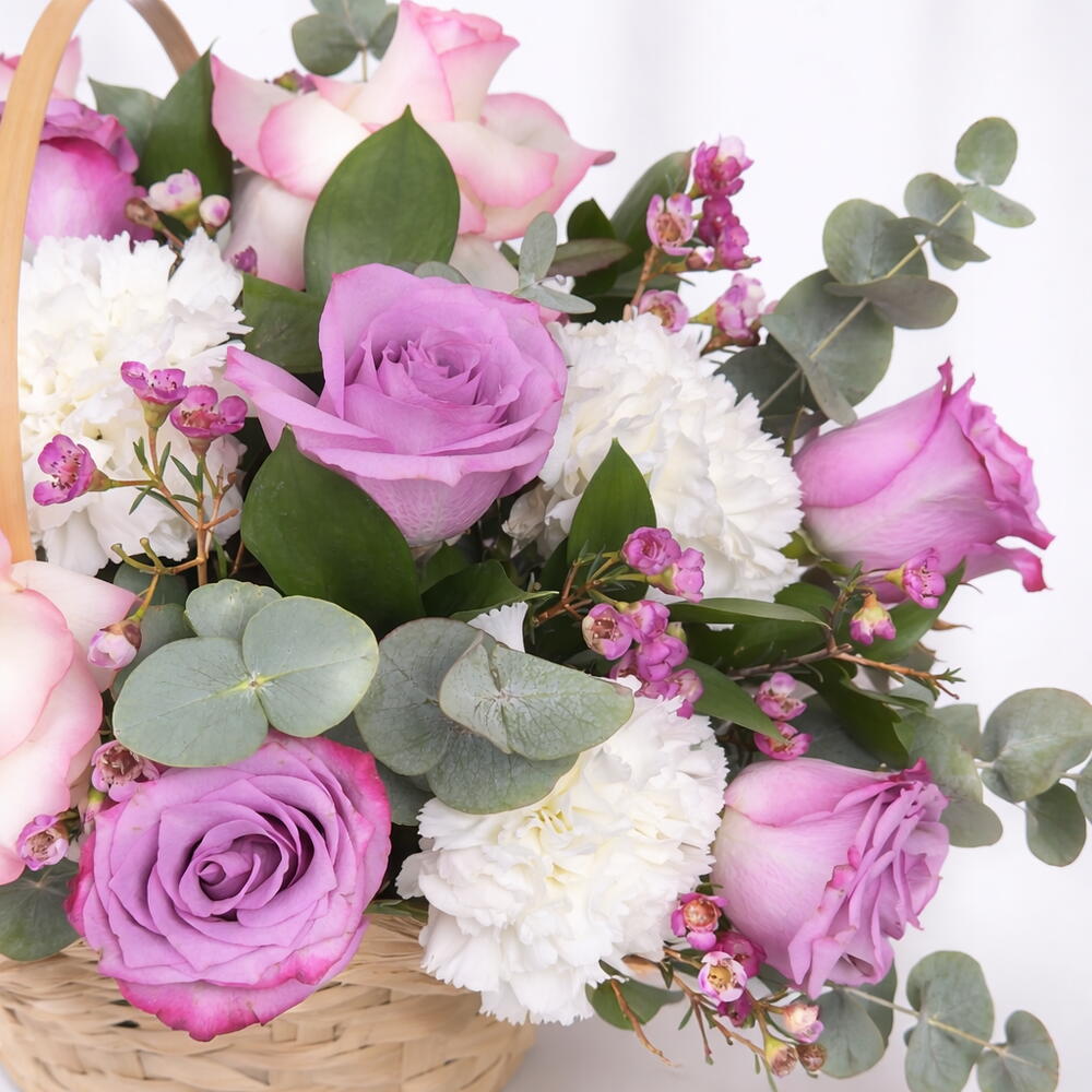 white carnations - 5 шт. cane basket - 1 шт. eucalyptus leaves - 6 шт. фиолетовые розы - 7 шт. стебли розовый воск - 3 шт. махровые розовые (jumelea) розы - 5 шт.