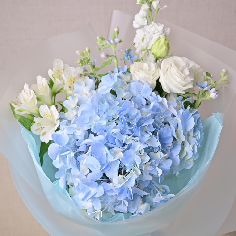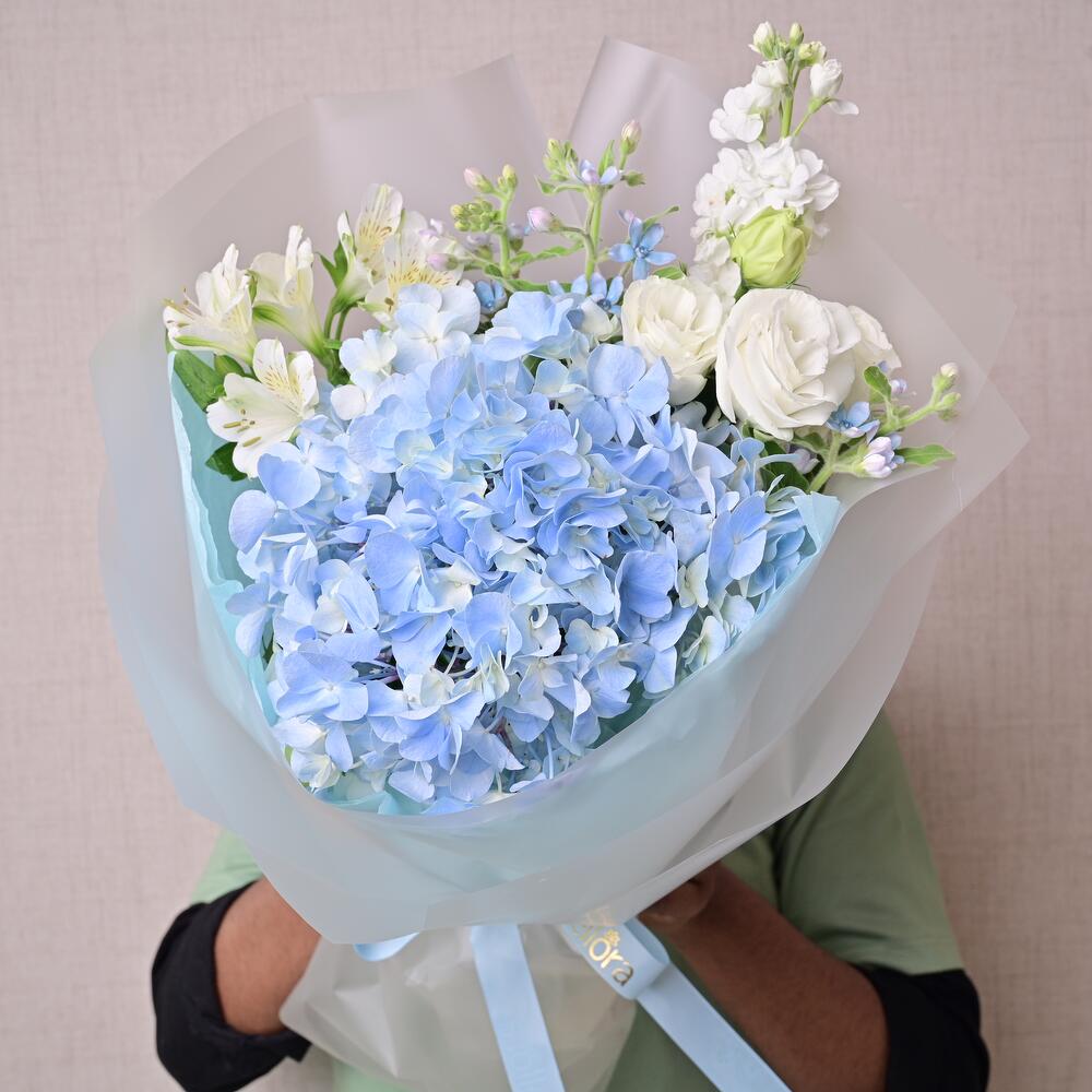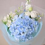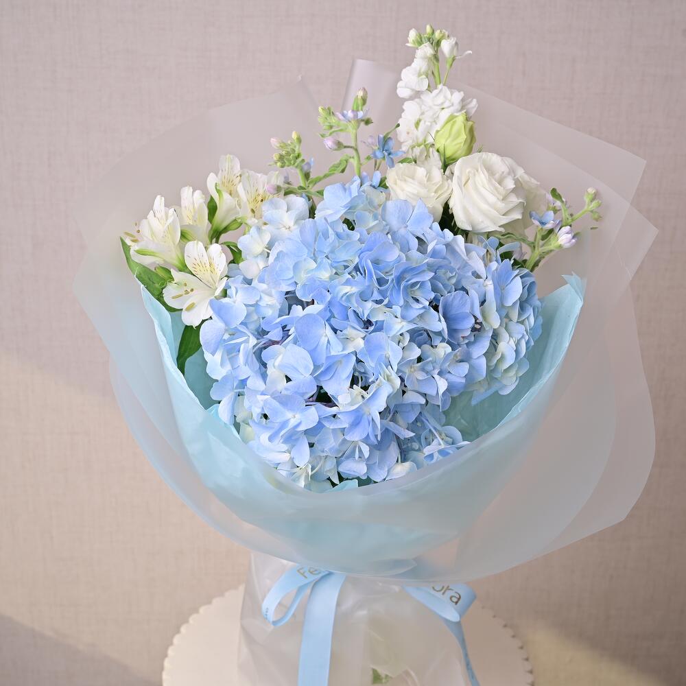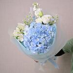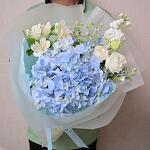 Изысканный букет из голубой гортензии, белой маттиолы, лизиантуса, альстромерии и оксипеталума. Создан для современного дарения и вневременного выражения.