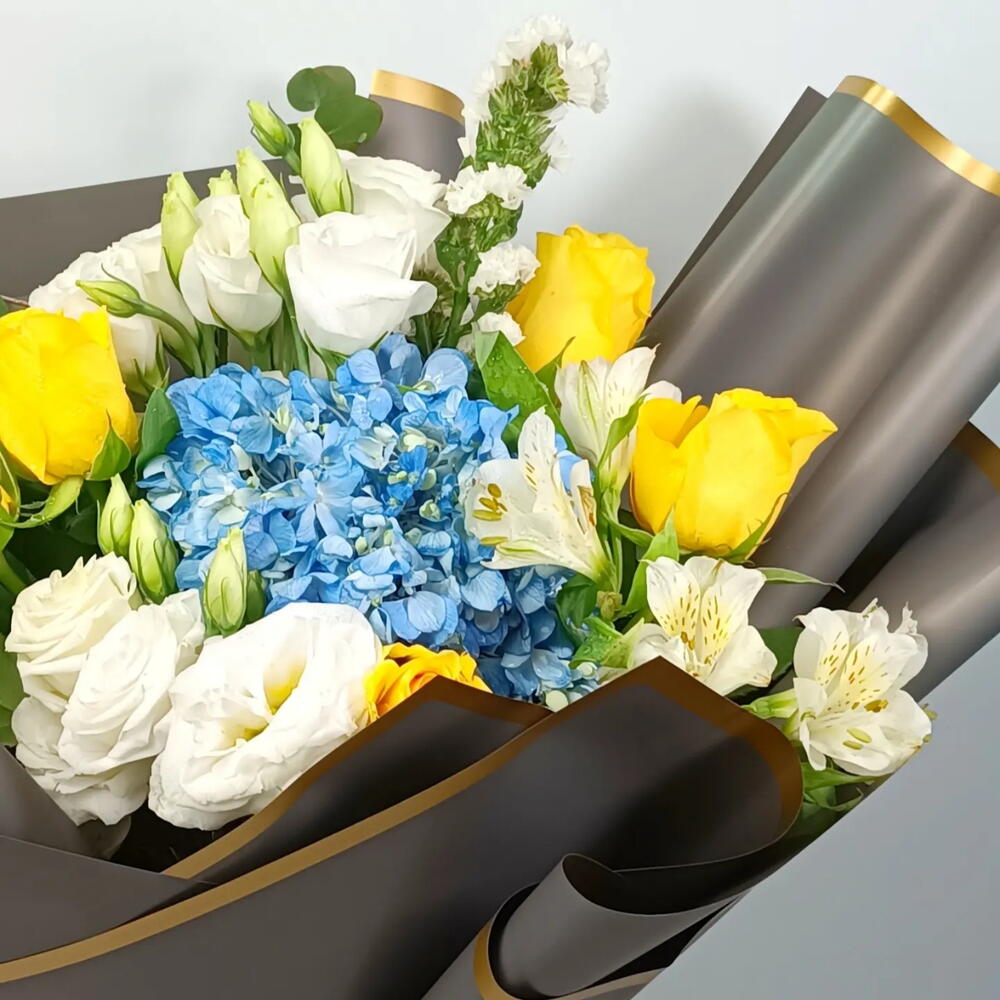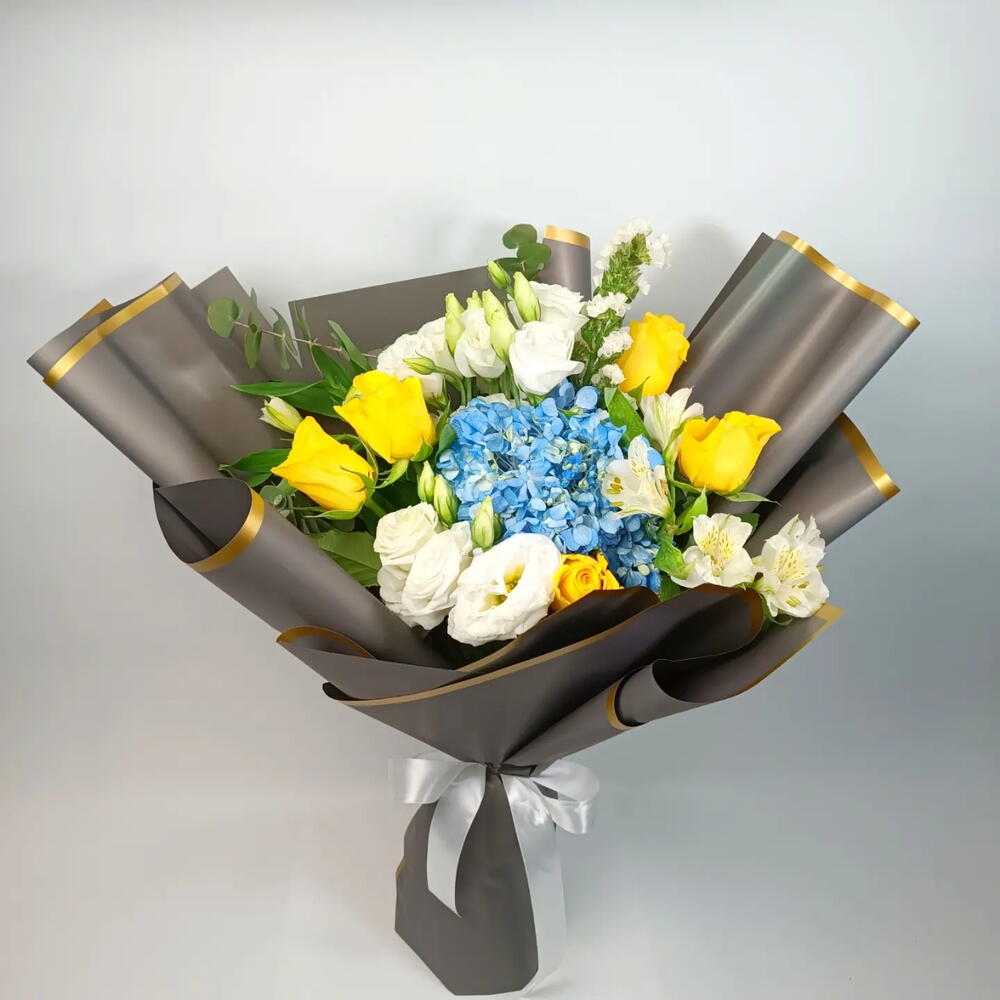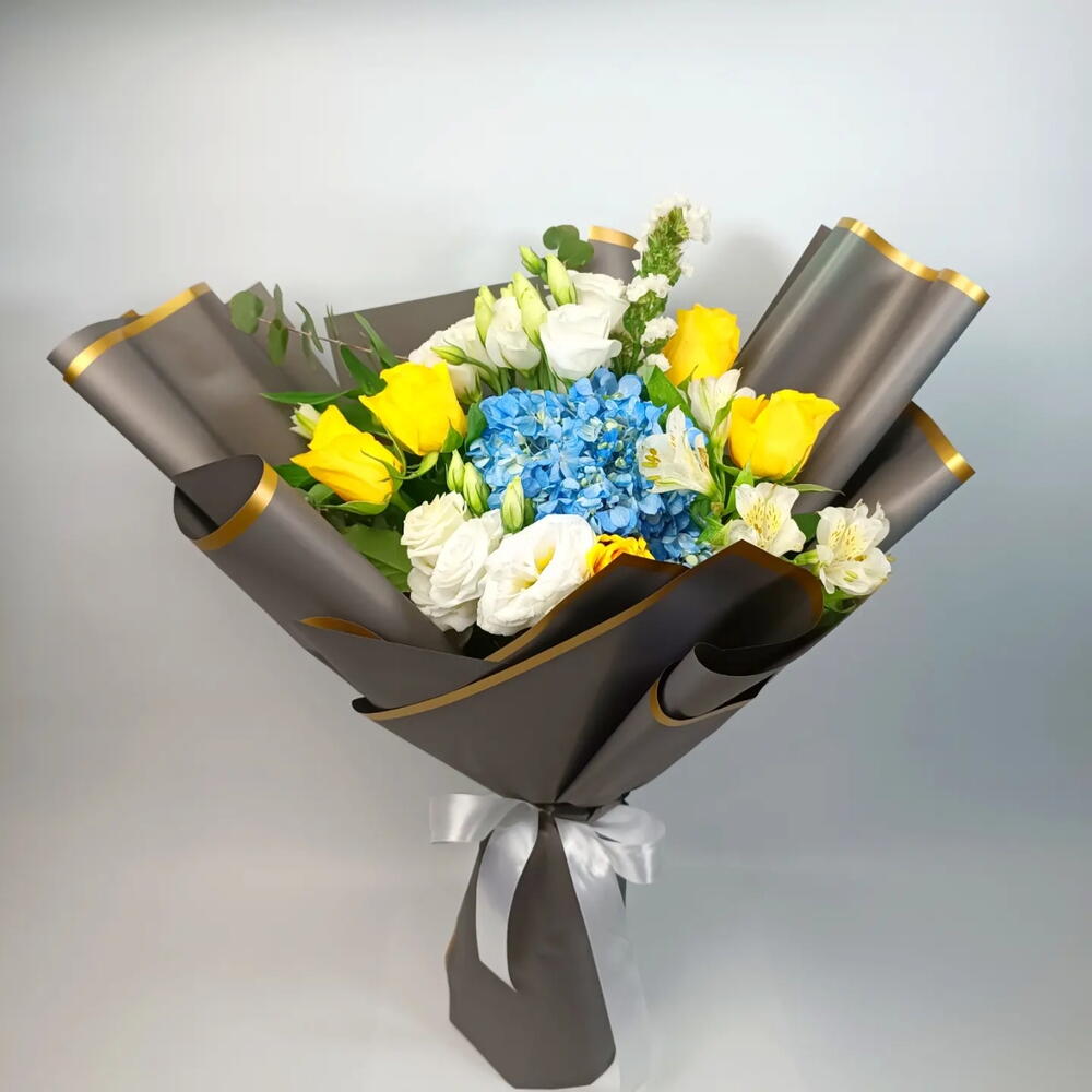 alstroemeria white - 2 шт. rose yellow - 4 шт. lisianthus white - 3 шт. статис уайт - 3 шт. hydrangea dark blue - 1 шт.