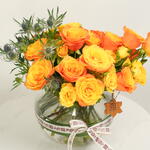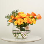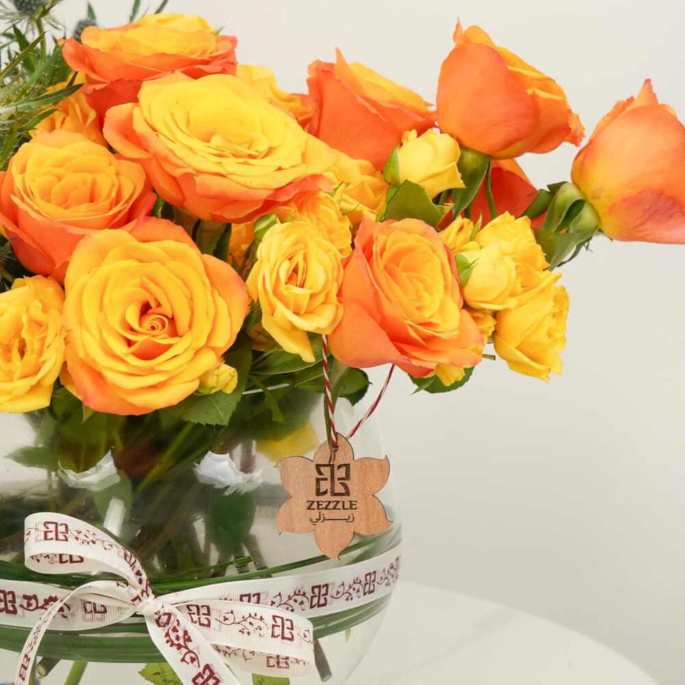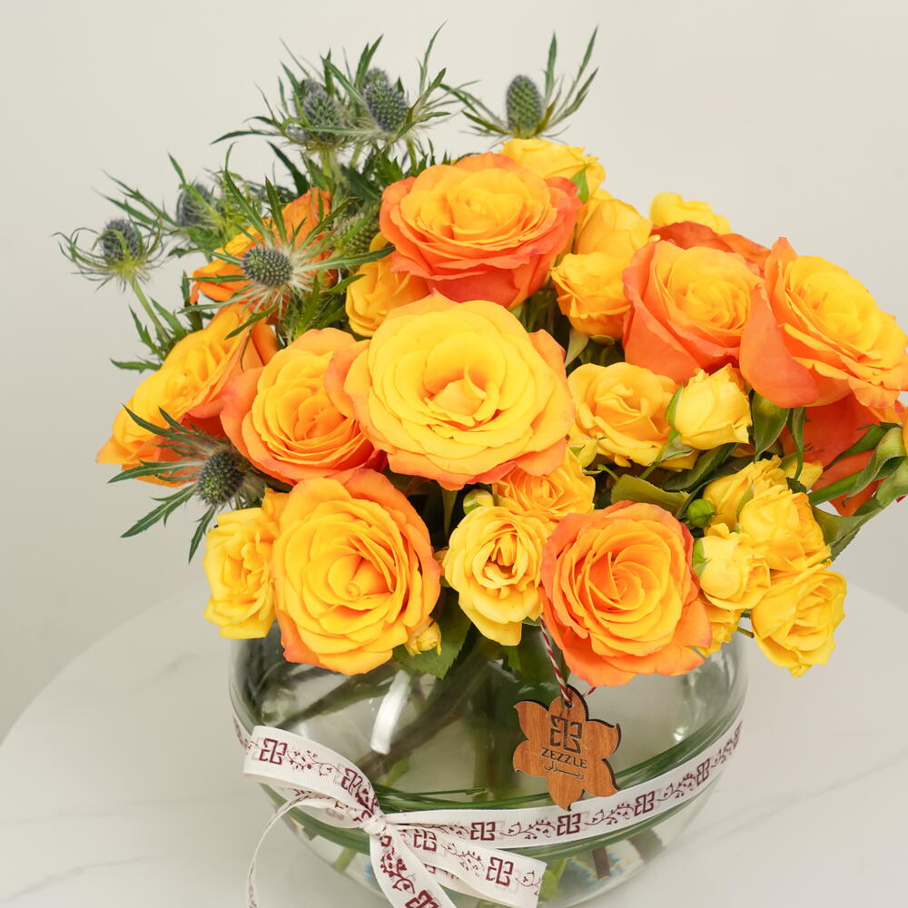 Восхитительная цветочная композиция с 10 яркими оранжевыми розами и 10 эффектными синими эрингиумами, элегантно расположенная в прозрачной стеклянной чаше. Идеально подходит для подарков, праздников и стильного домашнего декора.