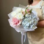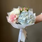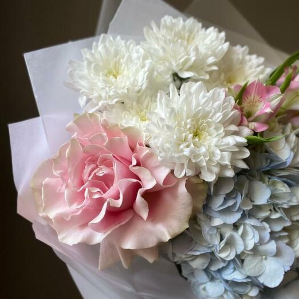 Окунитесь в чарующую красоту нашего изящного букета с гармоничным сочетанием нежно-голубой гортензии, элегантной французской розы, очаровательных кустовых хризантем и яркой альстромерии. Каждый цветок тщательно отобран, чтобы создать восхитительную композицию, излучающую грацию и утончённость. Нежные оттенки голубого, розового и белого сливаются воедино, формируя букет, идеально подходящий для любого повода — от дней рождения до годовщин или просто чтобы поднять кому-то настроение. Профессионально упакованный и продуманно оформленный, этот букет — вневременное выражение природной красоты и элегантности.