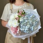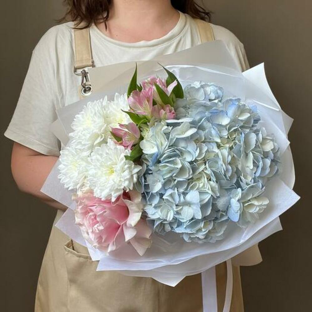 Hydrangea - 1 шт. Alstroemeria - 1 шт. packaging - 1 шт. спрей-хризантема - 1 шт. французская розовая роза - 1 шт.