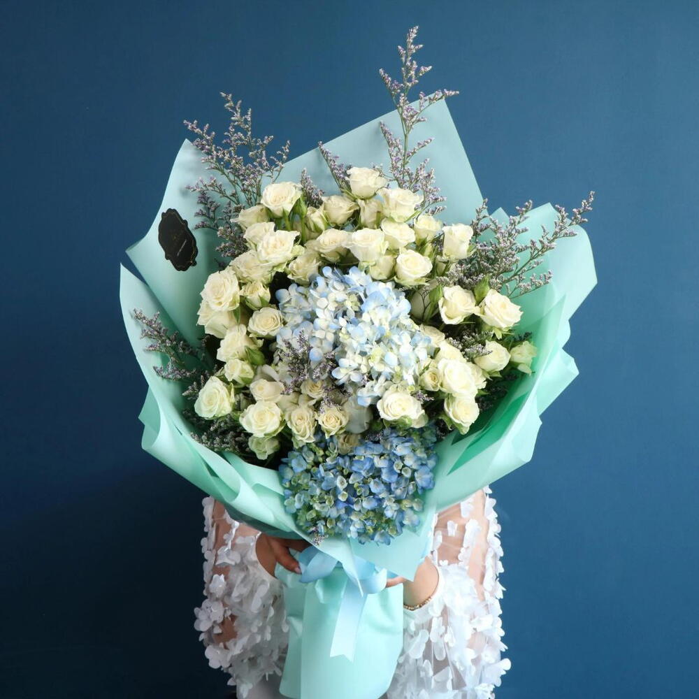 Виды цветов: белые мини-розы, синяя гортензия и каспия Инструкция по уходу: Меняйте воду ежедневно, желательно ставить в прохладном месте.