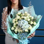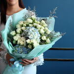 caspia - 5 шт. белая мини-роза - 11 шт. голубая гортензия - 2 шт. white roses - 7 шт.