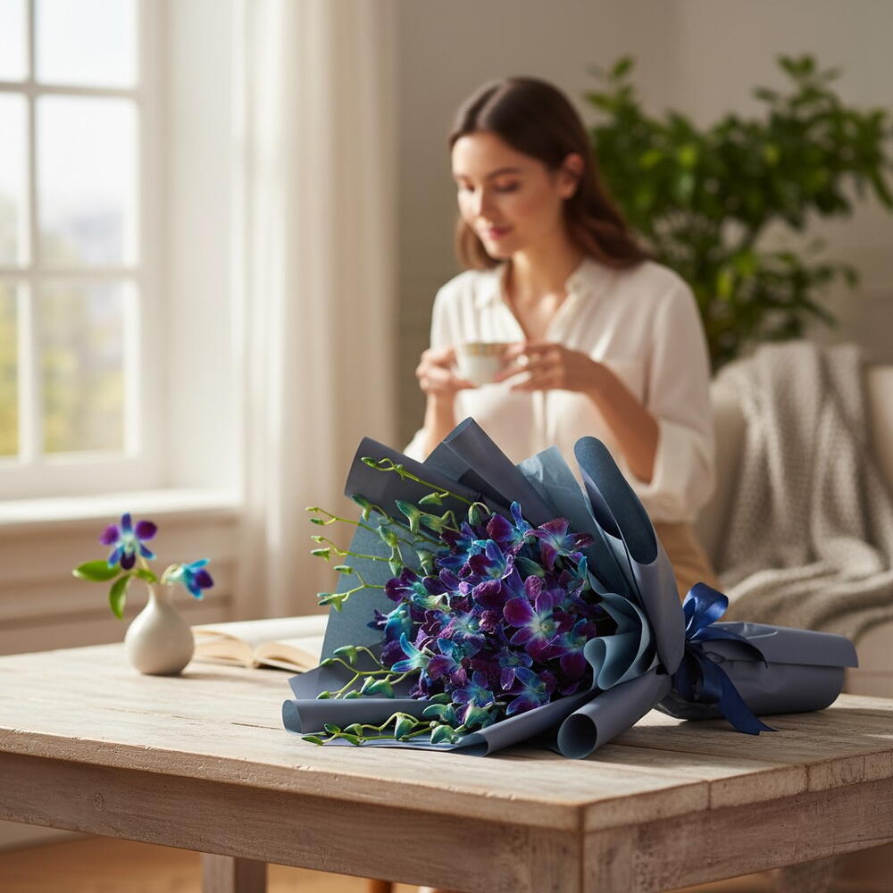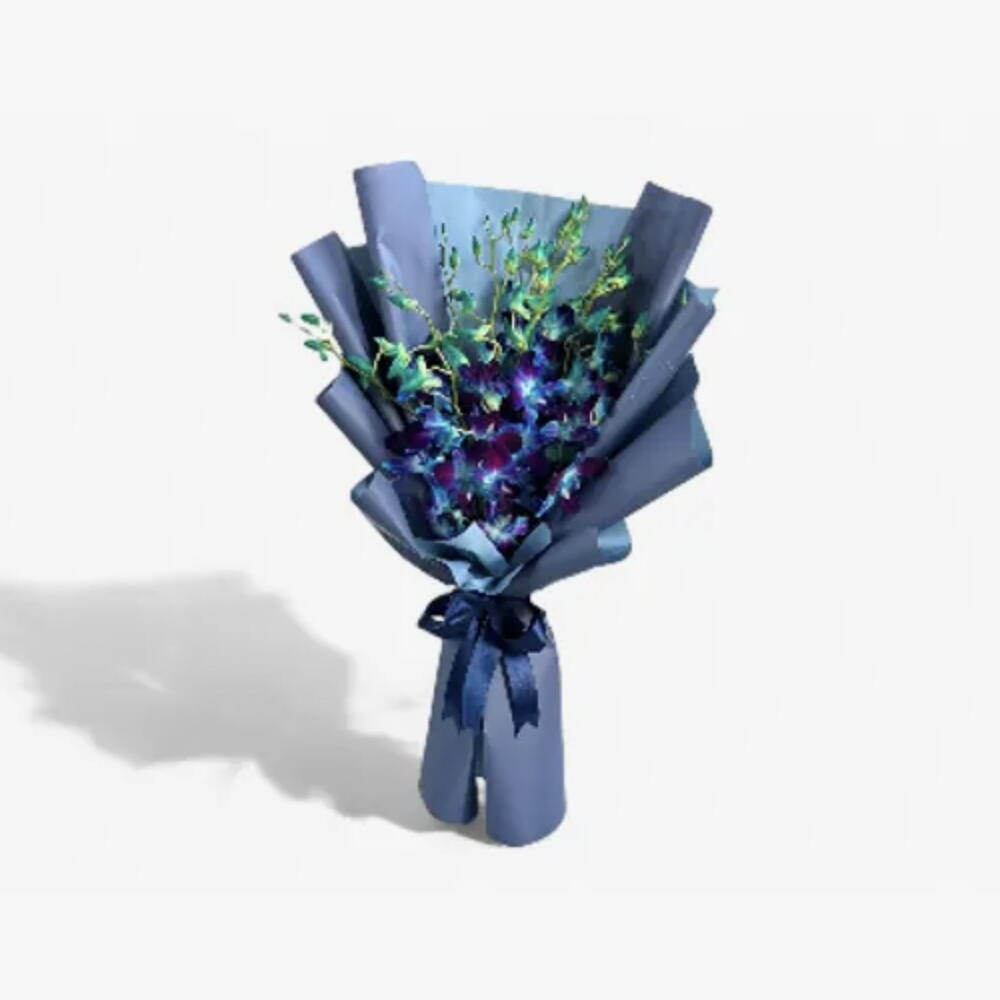Букет из 10 стеблей синих орхидей, дополненный свежими наполнителями и элегантно упакованный. Это экзотическая и эффектная композиция придаёт нотку элегантности и уникальности, идеально подходит для того, чтобы сделать смелое и красивое заявление.