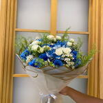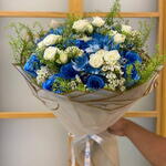 blue rose - 7 шт. wax - 3 шт. spery roses - 3 шт. синяя хризантема - 3 шт. аксессуар в букете - 11 шт.